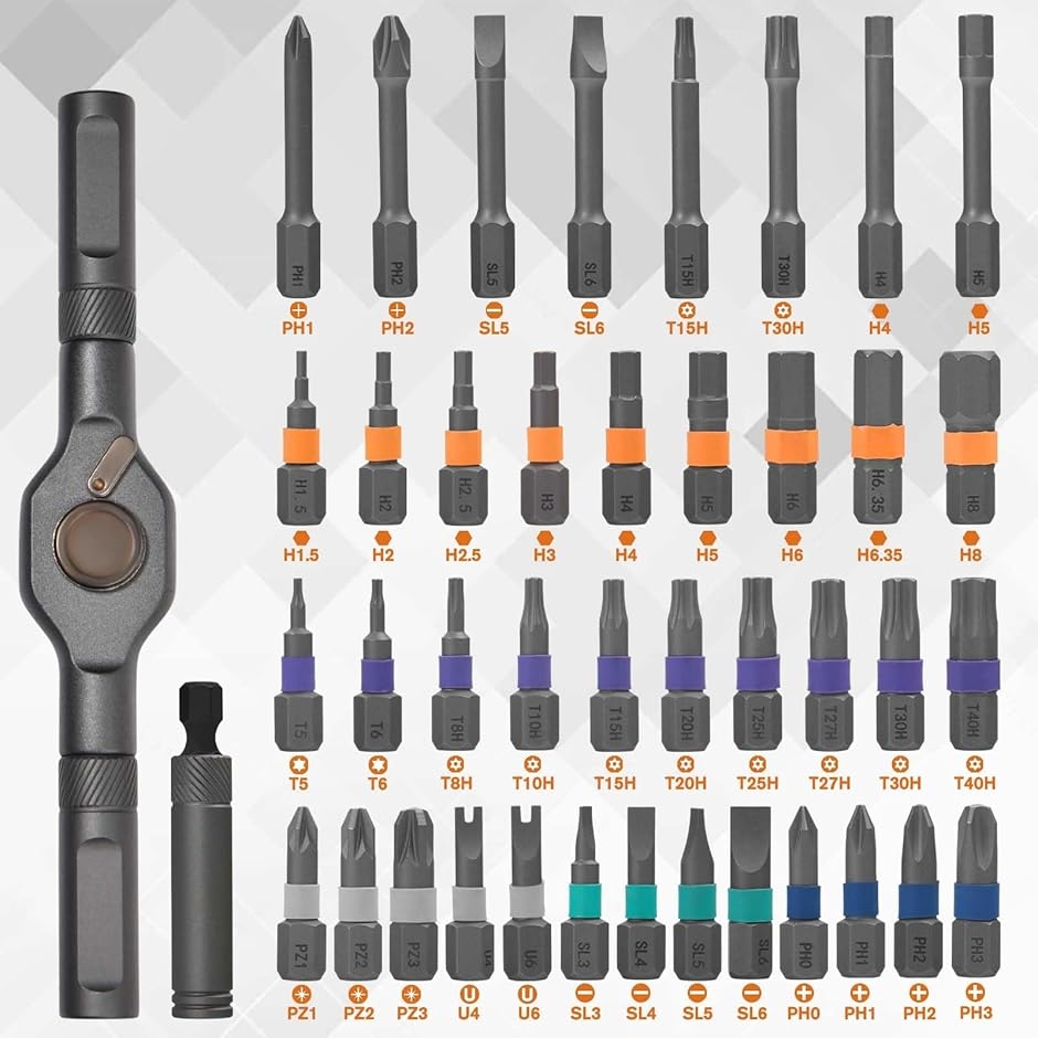 42 in 1 磁気ドライバー セット: ラチェット ドライバーには、8 つの長いビットと 32 の短いビットが付属しており、すばやく識別できるように色分けされたリング デザインが特徴です。