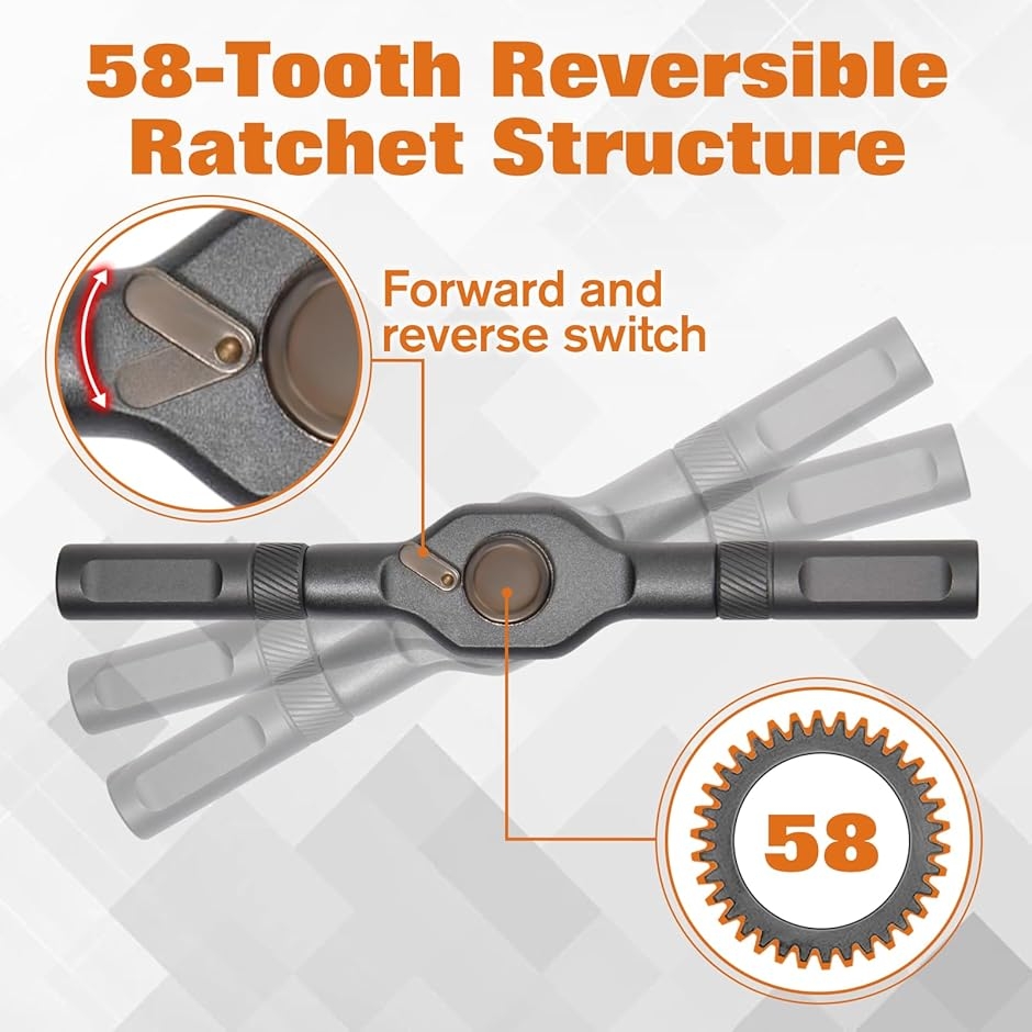 デザイン:省力化ラチェット設計、58歯の前進および逆ラチェット機構により、労力を80%削減し、6.2度のラチェット設計、快適なグリップ、長持ちする快適さ。