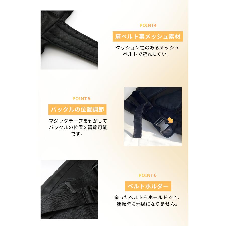 背面とショルダーベルト裏はメッシュクッションで長時間でも蒸れにくい仕様です。