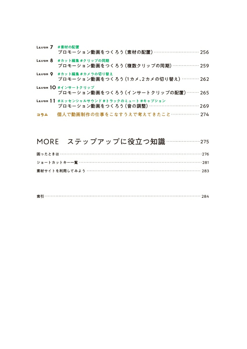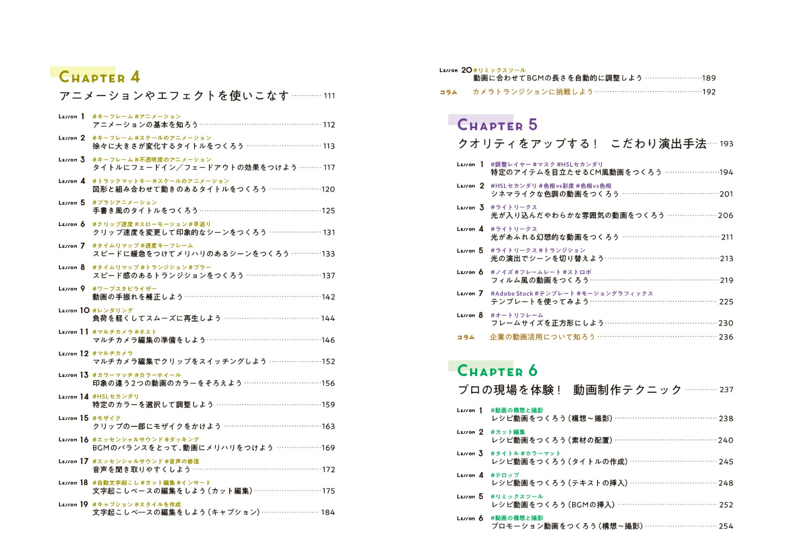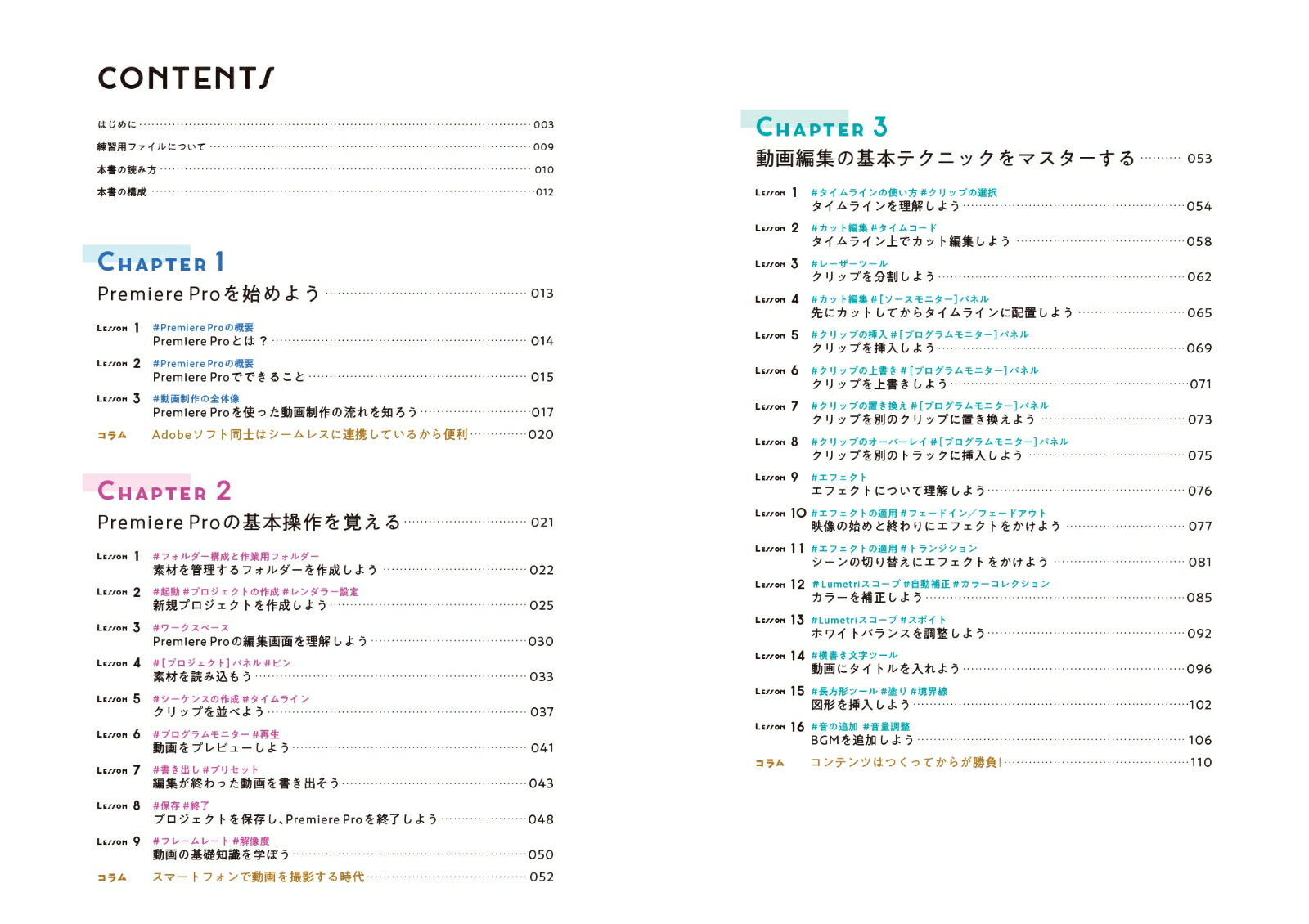 1 Premiere Proを始めよう/2 Premiere Proの基本操作を覚える/3 動画編集の基本テクニックをマスターする/4 アニメーションやエフェクトを使いこなす/5 クオリティをアップする!こだわり演出手法/6 プロの現場を体験!動画制作テクニック/MORE ステップアップに役立つ知識