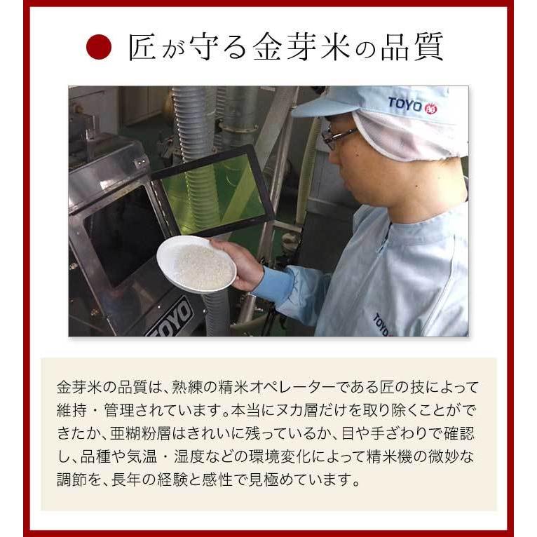 金芽米最大のポイントは、「亜糊粉層(あこふんそう)」と呼ばれる、旨みや栄養素が詰まった層を残して精米したこと。精米後のお米に残る胚芽の一部が金色に見えることから金芽米と名付けられました。金芽米は東洋ライスだけの独自技術であり、その品質は熟練の精米オペレーターによって維持・管理されています。