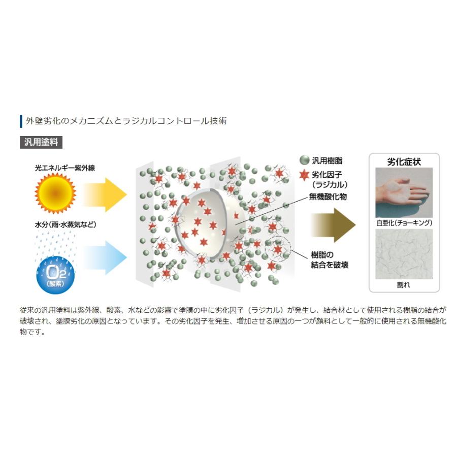 ・架橋による緻密かつ強靭な塗膜は、超耐久性、超耐候性を示すとともに耐水性、耐アルカリ性、耐薬品性に優る。汎用塗料と比較して汚れにくい塗膜構造。