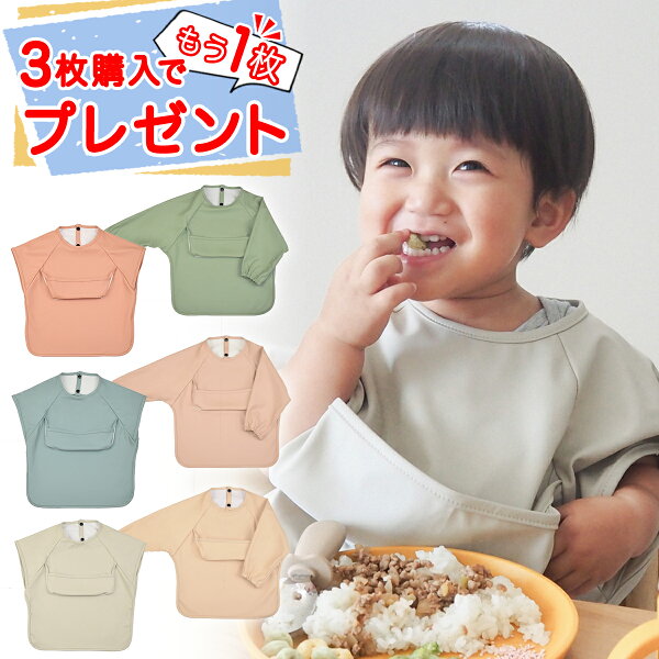 【赤字覚悟の大特価】【3枚同時購入でもう1枚追加プレゼント】お食事エプロン 半袖 長袖 ネームタグ付き 無地 上ポケットタイプ 保育園 離乳食 食べこぼしガード 防水