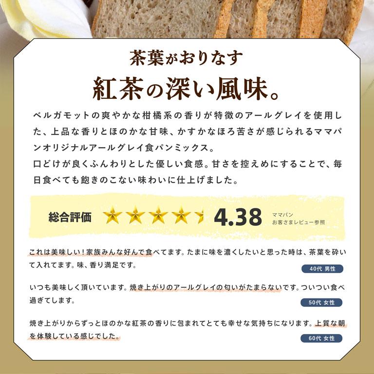 ベルガモットの爽やかな柑橘系の香りが特徴のアールグレイを使用した、上品な香りとほのかな甘味、かすかなほろ苦さが感じられるママパンオリジナルアールグレイ食パンミックス。