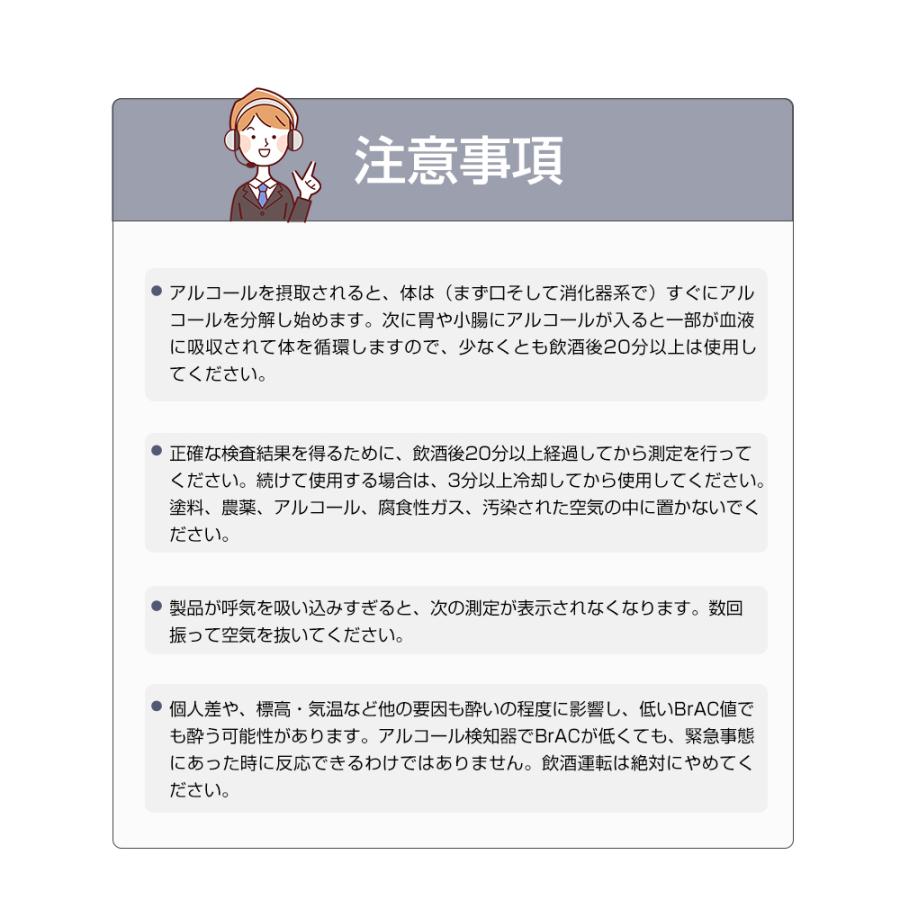 ※ アルコールチェッカーのセンサーには寿命があります。見かけ上の動作に問題がなくても感度が変わってしまったり、アルコールを検知しなくなっている場合もありますのでご注意ください。