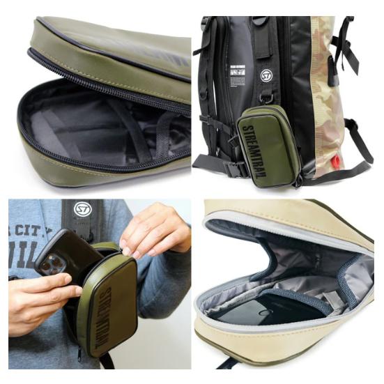 バックパックのショルダーストラップなどにフックで引っ掛けて持ち歩くことができるポーチです。ベルクロテープでの固定もできます。開口部が広く、モノの出し入れがしやすいのが特徴です。素材:ターポリンサイズ:幅10×高さ18×奥行5cm