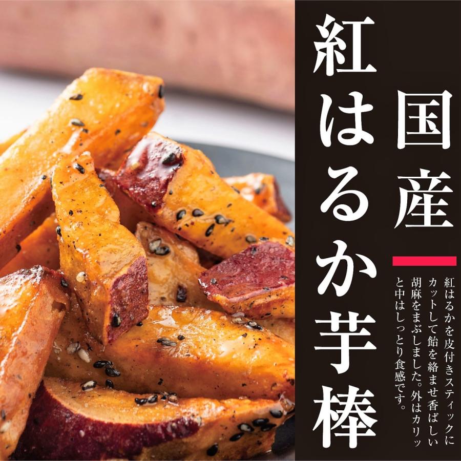 皮付きのままスティックにカットし、オリジナル製法で飴を絡ませ胡麻をまぶしました。