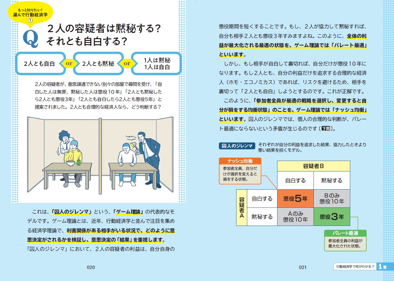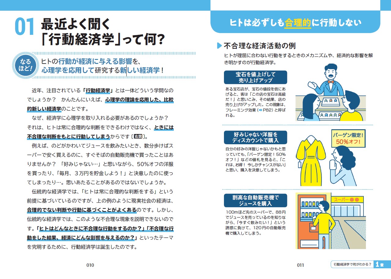 1章 行動経済学で何がわかる?(最近よく聞く「行動経済学」って何?/伝統的な経済学と行動経済学のちがいは?/行動経済学はどう役に立つの? ほか)/2章 もっと知りたい!行動経済学のしくみ(同じ内容の情報でも言い方で印象が変わる?/選択肢は3つがベスト?「極端性回避の法則」/「コントロールできる」というのはただの幻想? ほか)/3章 行動経済学の実践(ナッジ)と発展!(よりよい選択に誘導?「ナッジ」とは/命令に逆らいたくなる?「カリギュラ効果」/ナッジが重視するのは強制?それとも自由? ほか)