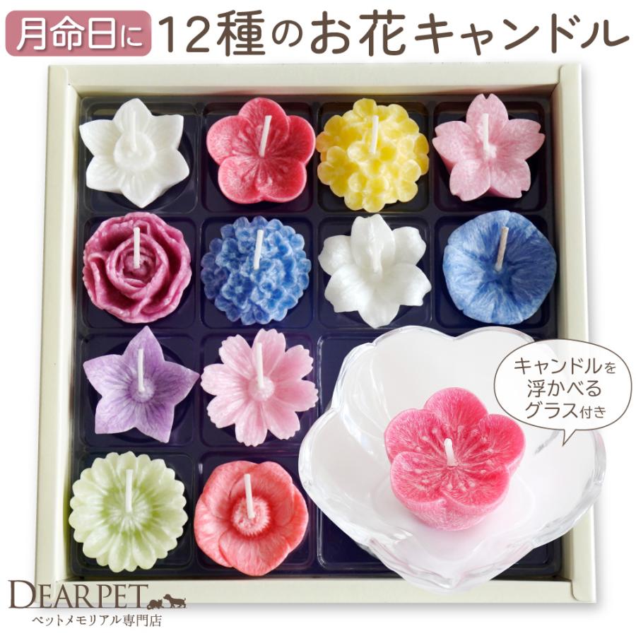 日本を代表する12ヶ月の花々を、水に浮かぶキャンドルにしました。もちろんお皿の上などで火を灯すこともできます。毎日のご供養にはもちろん、月命日などの特別な日に、ペットちゃんを想いながら灯しても素敵ですね。見た目の愛らしさだけでなく、それぞれのお花の香りにも心癒されます。お友達のペットちゃんへのお悔やみギフトとしてもご利用いただけます。