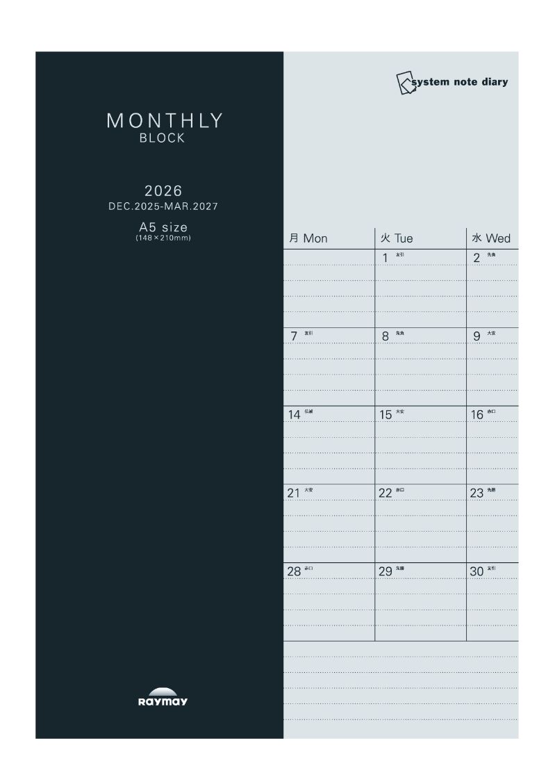 2026年版 A5サイズ レイメイ システムノートダイアリー マンスリー・ブロック【RFDR2673】サイズH210×W148mm 月曜始まり 掲載期間 2025年12月〜2027年3月 日付入り SYSTEM NOTE DIARY Raymay【 8冊までメール便対応可能 】