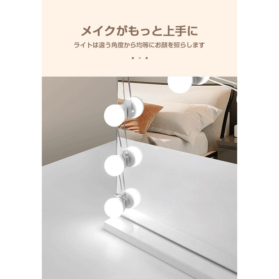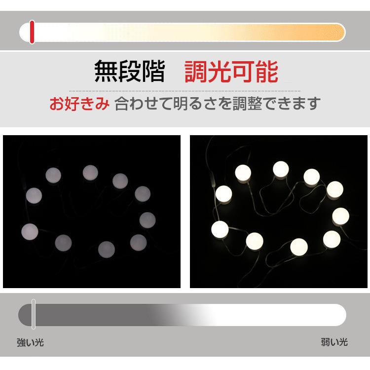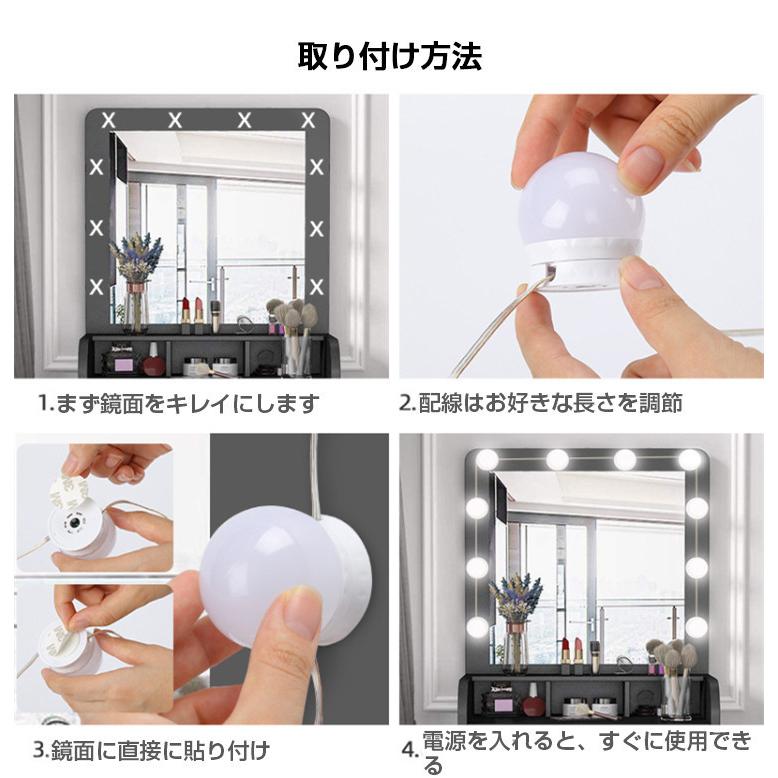 両面テープ/吸盤を電球に貼り付けてから、電球を回して好きな長さを調整して、鏡に貼り付けます、そして電源を入れると完成します。化粧鏡、更衣室、美容室などいろんな場所で適用られます。結婚式、誕生日パーティー、店のショーウインドー、寝室、バー、レストランLEDライトとしても完璧です。