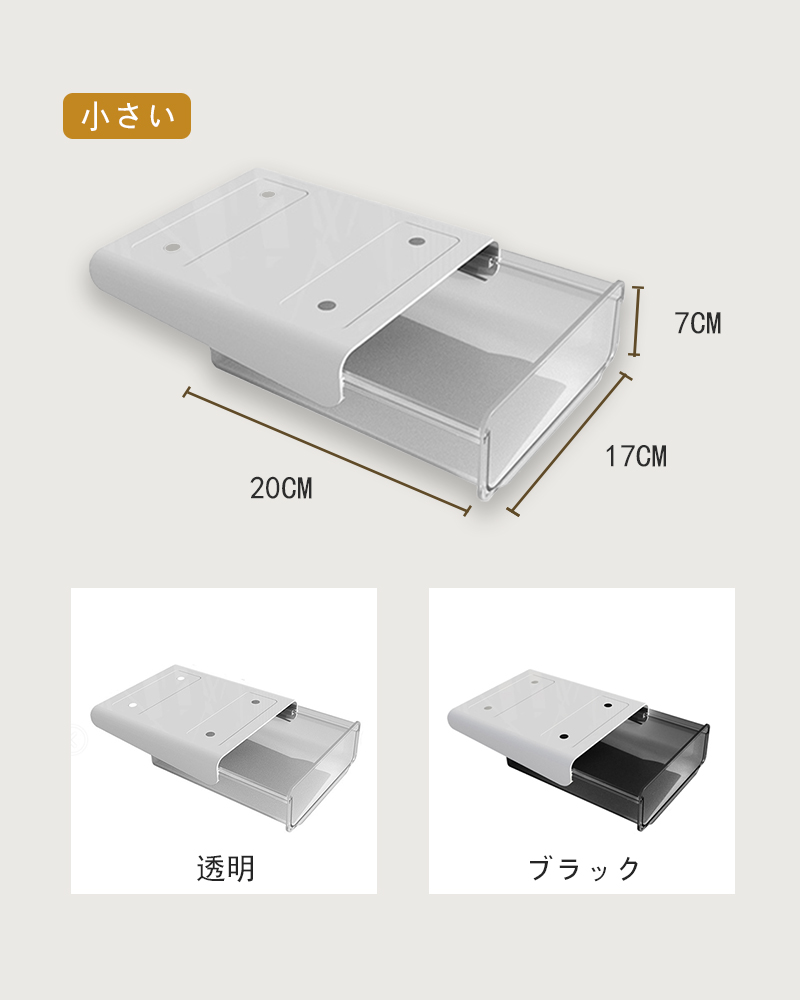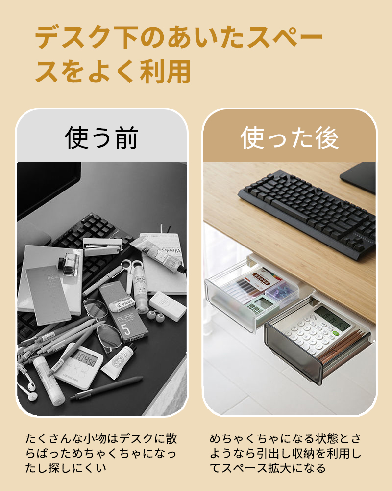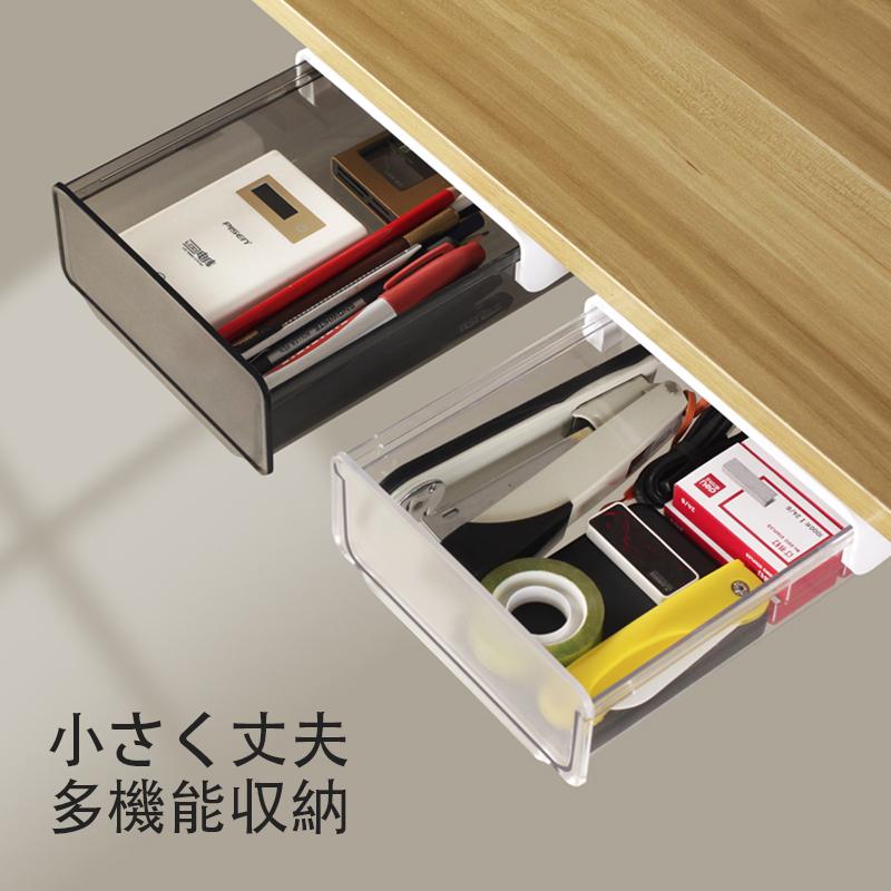【スペース活用&大容量】 本商品はデスクや棚下の空いたスペースとデッドスペースが活用できる取付式の引出しです。卓下の隠し式なので、台面のスペースを占めないことではなくて、スペース拡大になります。透明な材質ために物を見えやすいです。最大耐荷重は10kgぐらいがあり、日用置物の耐荷重が満足できます。