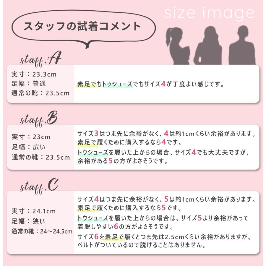 ・バレエシューズやトゥシューズの上から履く場合は、大きめのサイズをおすすめします。