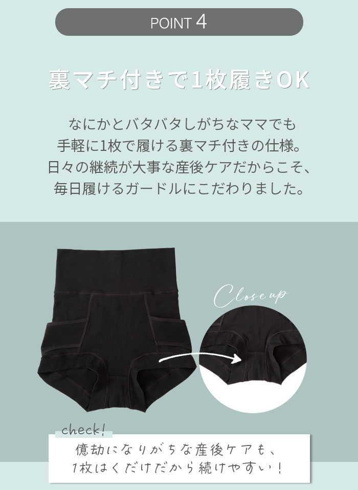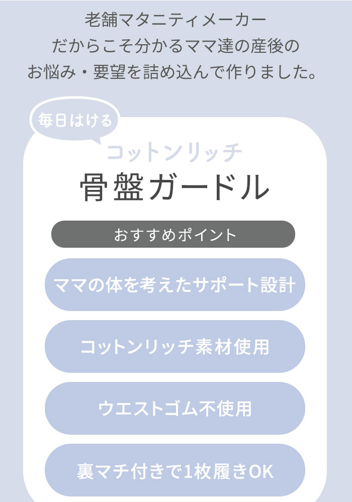育児しながら骨盤とお腹を引き締める、綿リッチな産後ガードル<br>長く使用できて、動きやすい毎日履けるガードルです。<br>着用は産後1ヶ月前後〜1年程度継続使用されることをおススメします。<br>◆品質/綿95%・ポリウレタン5%<br>◆サイズ/<br>M:ウエスト61〜67cm、ヒップ83〜93cm<br>L:ウエスト67〜73cm、ヒップ86〜96cm<br>LL:ウエスト73〜79cm、ヒップ89〜99cm<br><br>