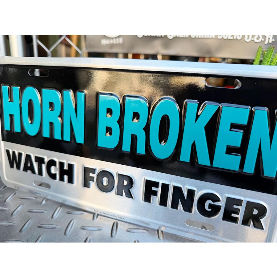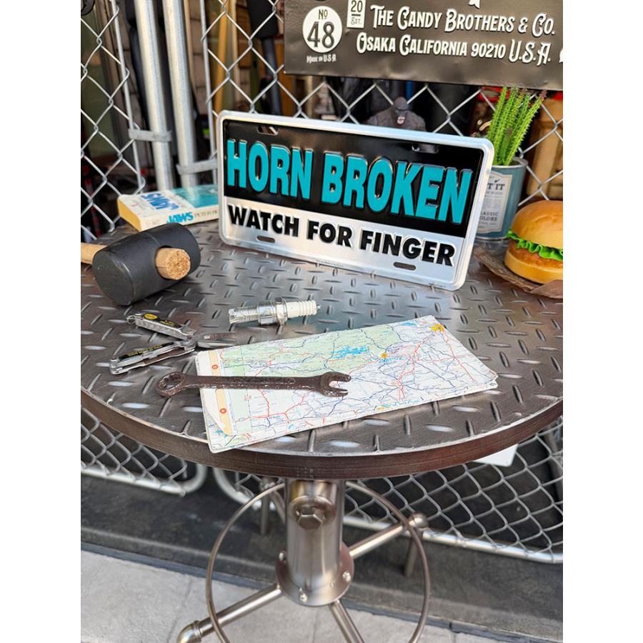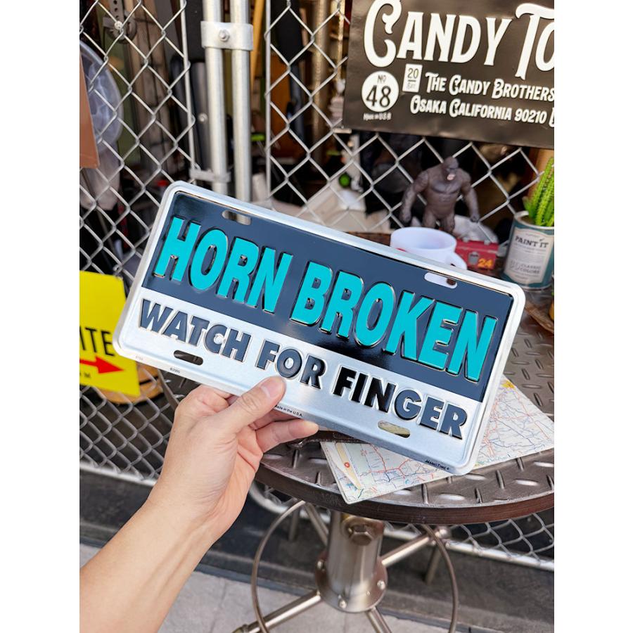 「ホーンがブッ壊れてるからオレの指を見な!」って書かれたこの看板、つまり中指立てて「ファ○ク・ユー!」ってこと!そんな強烈なブラックジョークをライセンスプレートで飾れるアメリカらしいデザインの1枚です。ホーンってだけに車のリアガラスから見えるように飾るのが一番なのかな!くれぐれもシバかれないように!( ̄∀ ̄)Ψ サイズ:横30.5cm×縦15cm(約)