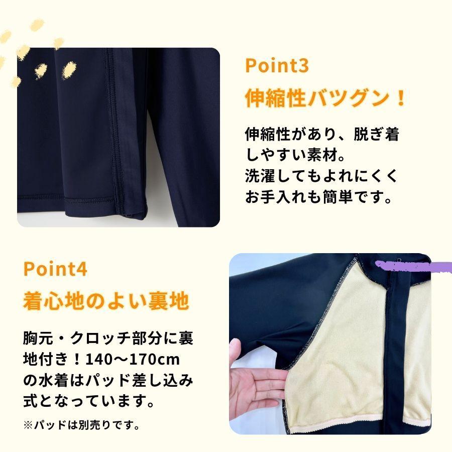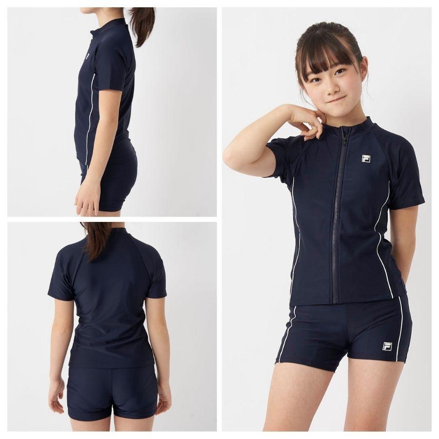 学校やスイミングスクールなどの着用に最適なスクール対応スイムウェア。ファスナー付きの半袖タイプで日焼け対策もばっちり!