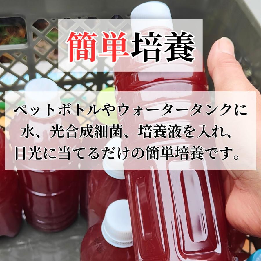 光合成細菌 PSB 40L培養セット 簡単培養説明書 スポイト付き厳選してから出荷する濃い光合成細菌と、光合成細菌の栄養素に特化した培養液で、はじめての方でも簡単に培養する事ができます。農薬・化学肥料不使用なので、様々な用途に安心してご利用いただけます。特有の匂いがありますので、室内での培養時はご注意ください。