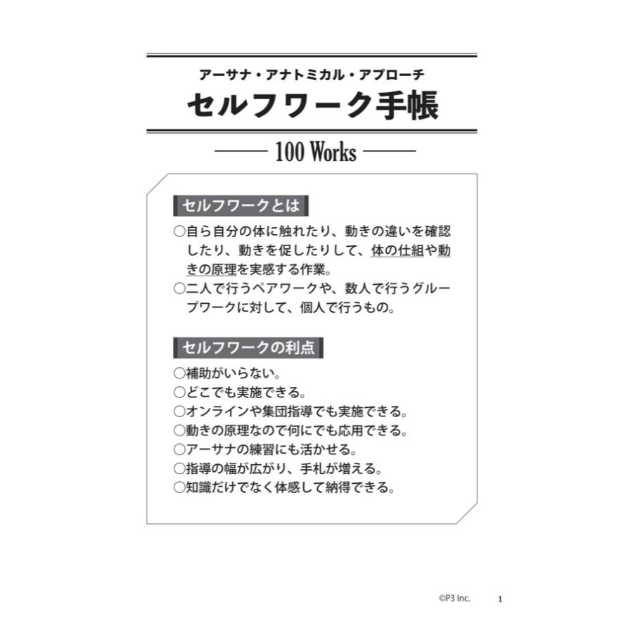 セルフワークとは自ら自分の体に触れたり、動きの違いを確認したり、動きを促したりして、体の仕組や動きの原理を実感する作業です。触れることなく行えるセルフワークは、オンライン指導も含めて今後さらに重要な指導法となります。現時点で最高なワークが詰まっています。指導にお役立て下さい。【A6ハガキサイズ・117P・全100Work】