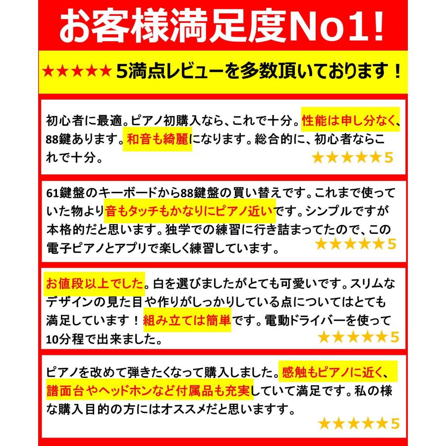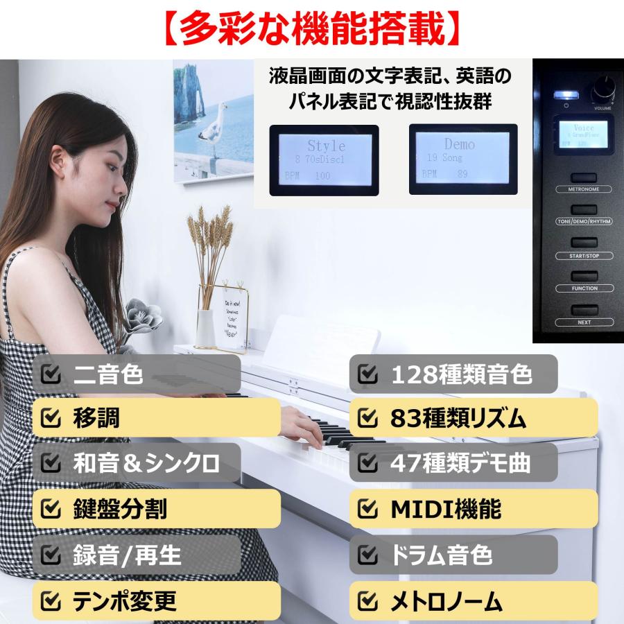 ●【本格的な弾き心地】生ピアノの鍵盤サイズと同じ、全音域に対応でき標準88鍵ハンマーアクション鍵盤を搭載、鍵盤の重さが低音部では重く、高音部では軽くなるように、音域によって弾きごたえを段階的に変化させ、アコースティックピアノのタッチに迫る本格的なピアノ演奏が楽しめます。