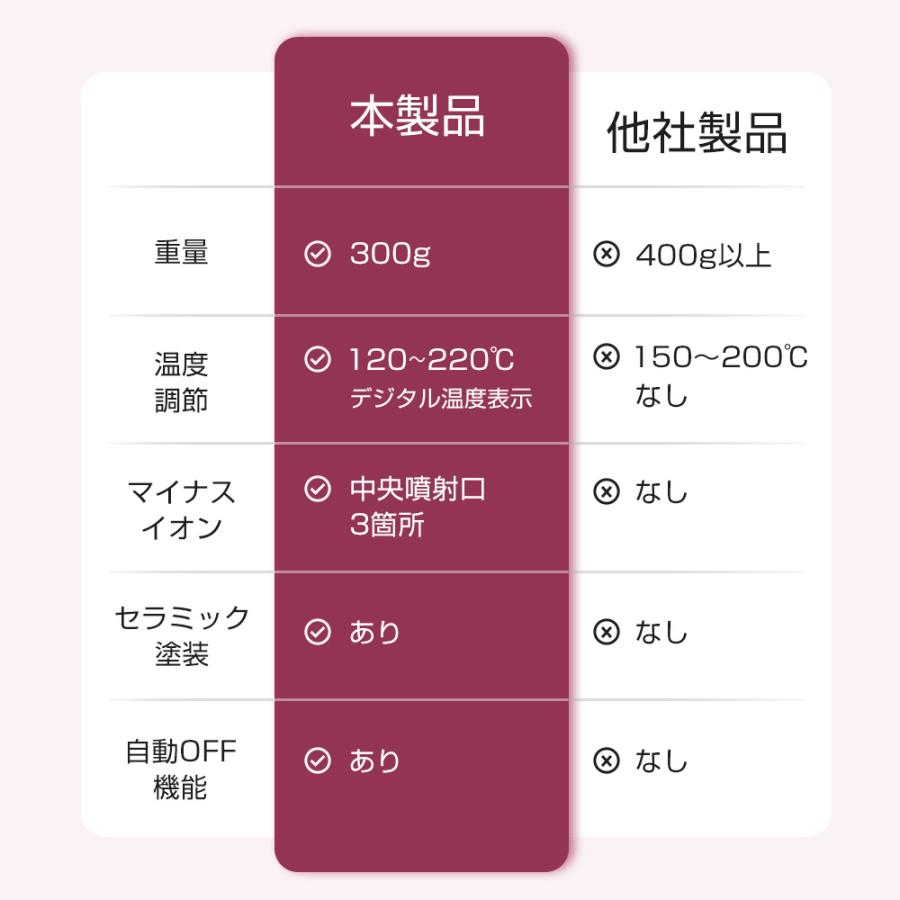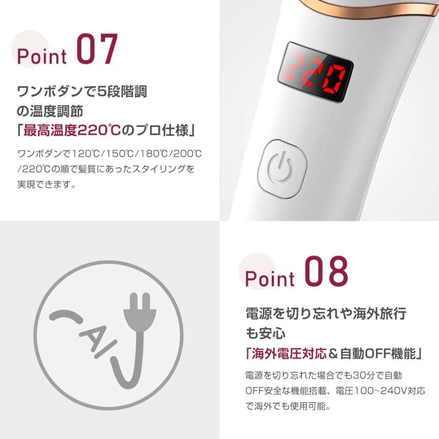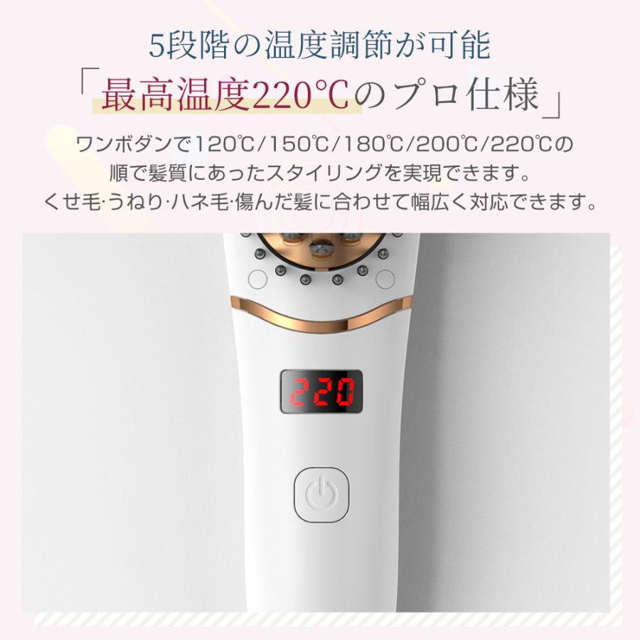 【5段温度設定&デジタル温度表示】温度を表示しているディスプレイ、ワンボタンで120℃/150℃/180℃/200℃/220℃の順で髪質にあったスタイリングを実現できる。
