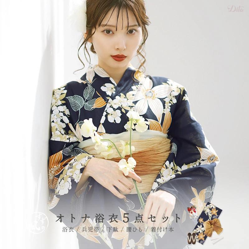 レディース 浴衣 セット 簡単(ゆかた・しわ兵児帯・下駄・着付け本・腰ひも)綿 レトロ 紺 オレンジ 大人 上品 派手 和風 モダン 10代 20代 30代 2025年