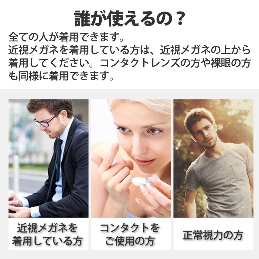 近視、遠視、老眼鏡の眼鏡をかけた人もご利用できます。ゆったりとした構造で圧迫感がありません。レンズ周りのカバーが花粉や粉じんなどから目や視界を守ります。