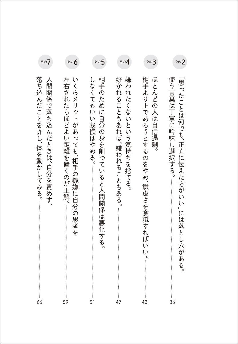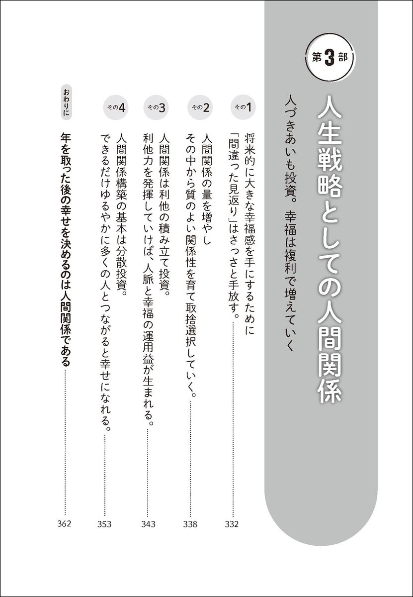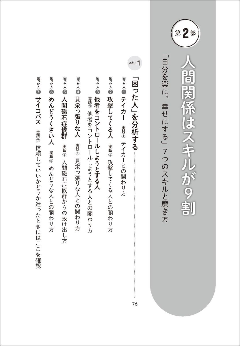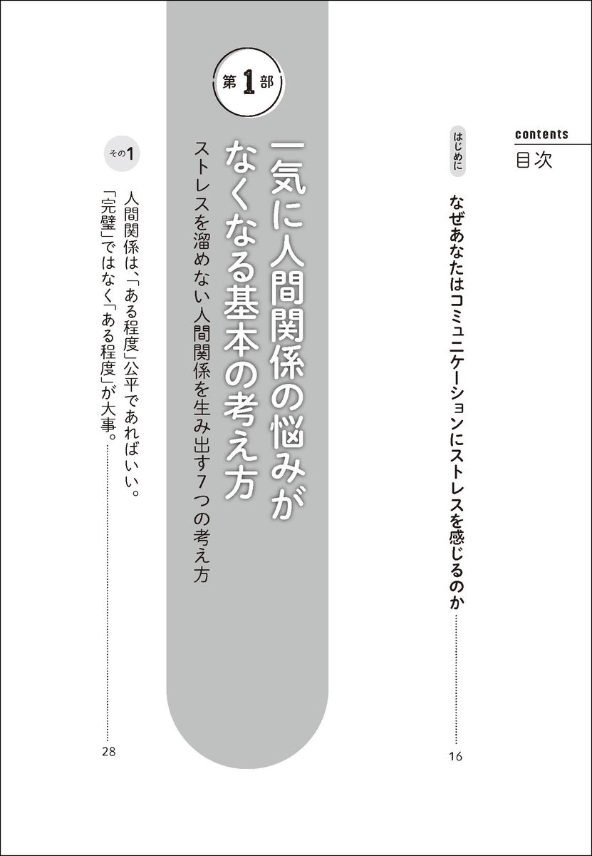 第1部 一気に人間関係の悩みがなくなる基本の考え方 ストレスを溜めない人間関係を生み出す7つの考え方(人間関係は、「ある程度」公平であればいい。「完璧」ではなく「ある程度」が大事。/「思ったことは何でも、正直に伝えた方がいい」には落とし穴がある。使う言葉は丁寧に吟味し選択する。/ほとんどの人は自信過剰。相手より上であろうとするのをやめ、謙虚さを意識すればいい。 ほか)/第2部 人間関係はスキルが9割 「自分を楽に、幸せにする」7つのスキルと磨き方(「困った人」を分析する/怒りをコントロールする 怒りをコントロールできれば自分が救われる 怒りは湧いて当然。振り回されなければいいだけ/アサーティブに関わる 言いにくいことも自分の言葉で伝えるテクニックを磨く ほか)/第3部 人生戦略としての人間関係 人づきあいも投資。幸福は複利で増えていく(将来的に大きな幸福感を手にするために「間違った見返り」はさっさと手放す。/人間関係の量を増やしその中から質のよい関係性を育て取捨選択していく。/人間関係は利他の積み立て投資。利他力を発揮していけば、人脈と幸福の運用益が生まれる。 ほか)