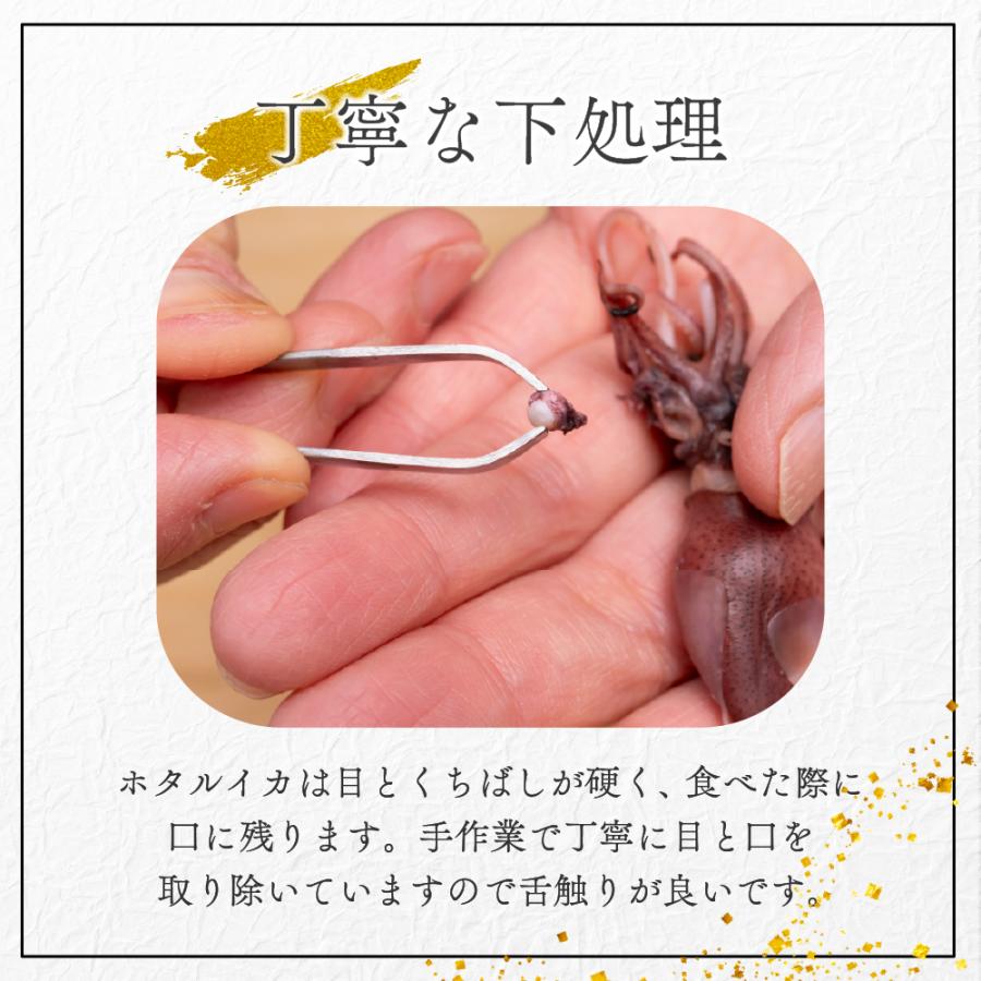 【原材料】ホタルイカ【内容量】500g【賞味期限】冷凍(-18℃以下)で約90日※解凍後はお早めにお召し上がりください。【解凍方法】流水解凍【調理方法】解凍後はお早めにお召し上がりください。再冷凍は味・品質・鮮度が落ちますのでお控えください。しゃぶしゃぶもオススメです。
