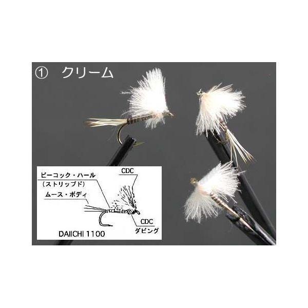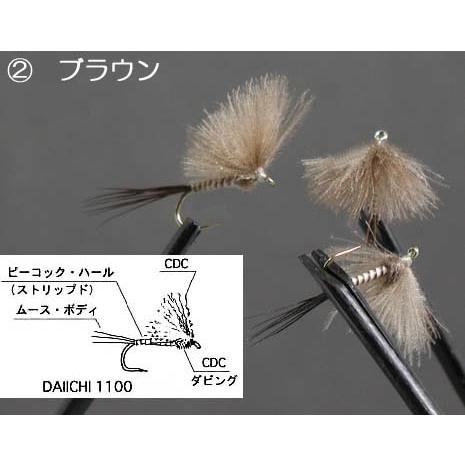 ウイングは、複数枚のCDCファイバーを組み合わせ、全体が「なだらかな三角錐状」。そのため水面での安定や、濡れた際の復帰はとても良好です。またソラックス部には、ウイングの形状保持機能を兼ね、CDCをタイトにダビングした「ボール」を設置。これらの相乗効果で、本フライは水面で倒れることなく浮き、また小型カゲロウ種と同質のライトパターンを得ています。千曲川、忍野、湯川などの「里川、湧水河川」で、まずは最初に結ぶべきフライです。
