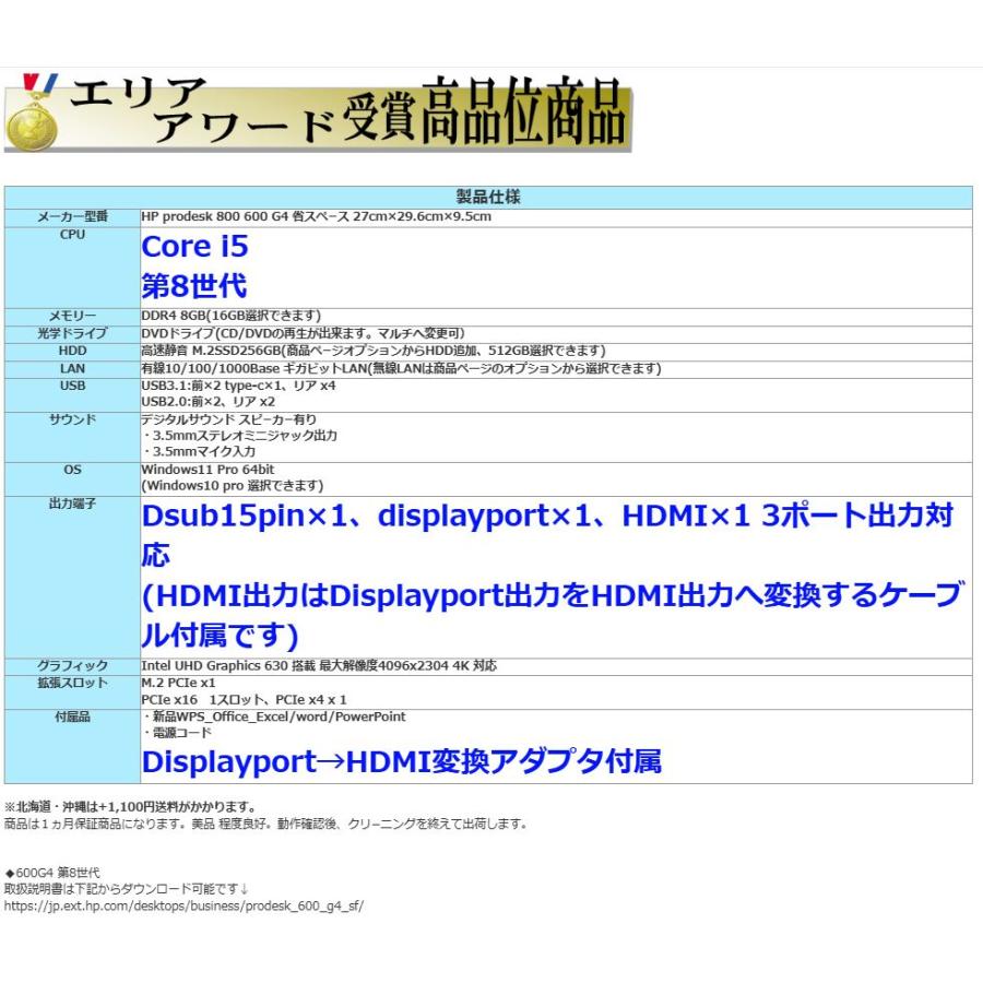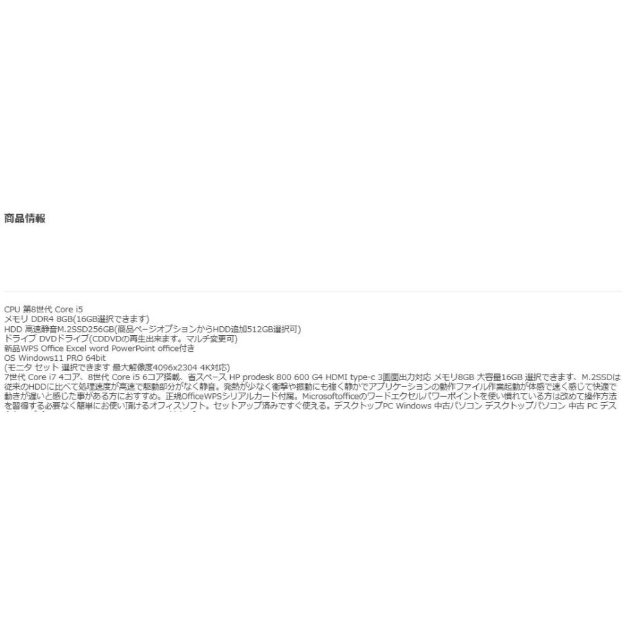 7世代 Core i7 4コア、8世代 Core i5 6コア搭載、省スペ−ス HP prodesk 800 600 G4 HDMI type-c 3画面出力対応 メモリ8GB 大容量16GB 選択できます、M.2SSDは従来のHDDに比べて処理速度が高速で駆動部分がなく静音。発熱が少なく衝撃や振動にも強く静かでアプリケ−ションの動作ファイル作業起動が体感で速く感じて快適で動きが遅いと感じた事がある方におすすめ。正規OfficeWPSシリアルカード付属。Microsoftofficeのワードエクセルパワーポイントを使い慣れている方は改めて操作方法を習得する必要なく簡単にお使い頂けるオフィスソフト。セットアップ済みですぐ使える。デスクトップPC Windows 中古パソコン デスクトップパソコン 中古 PC デスクトップパソコン Windows11 Win11 office付き パソコン i5 i3 DELL 3060 3070 G5 400 500 福袋 8500 8400 9世代
