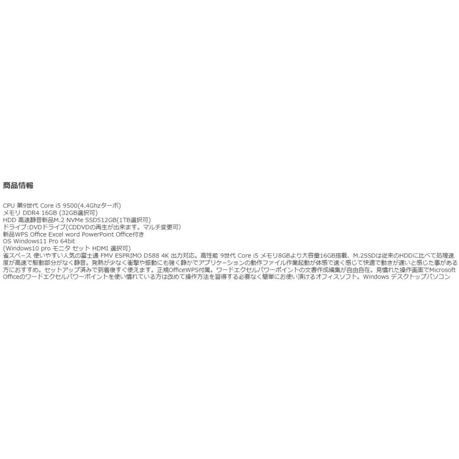 省スペ−ス 使いやすい人気の富士通 FMV ESPRIMO D588 4K 出力対応。高性能 9世代 Core i5 メモリ8GBより大容量16GB搭載、M.2SSDは従来のHDDに比べて処理速度が高速で駆動部分がなく静音。発熱が少なく衝撃や振動にも強く静かでアプリケ−ションの動作ファイル作業起動が体感で速く感じて快適で動きが遅いと感じた事がある方におすすめ。セットアップ済みで到着後すぐ使えます。正規OfficeWPS付属。ワードエクセルパワーポイントの文書作成編集が自由自在。見慣れた操作画面でMicrosoftOfficeのワードエクセルパワーポイントを使い慣れている方は改めて操作方法を習得する必要なく簡単にお使い頂けるオフィスソフト。Windows デスクトップパソコン Windows11 Win11 デスクトップPC 中古 PC パソコン office付き i5 i3 安い 富士通 lenovo 9400 NEC 10世代 福袋