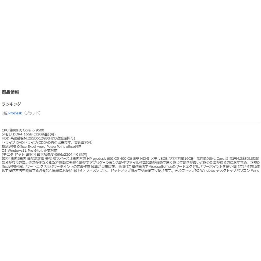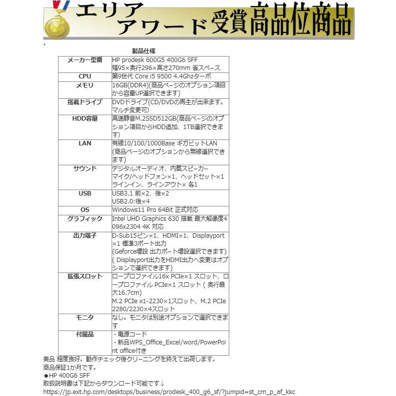 最大4画面5画面 商品高評価 美品 省スペ−ス 3画面対応 HP prodesk 600 G5 400 G6 SFF HDMI メモリ8GBより大容量16GB、高性能9世代 Core i5 高速M.2SSDは駆動部分がなく静音。発熱が少なく衝撃や振動にも強く静かでアプリケ−ションの動作ファイル作業起動が体感で速く感じて動きが遅いと感じた事がある方におすすめ。正規OfficeWPS付属。ワードエクセルパワーポイントの文書作成 編集が自由自在。見慣れた操作画面でMicrosoftofficeのワードエクセルパワーポイントを使い慣れている方は改めて操作方法を習得する必要なく簡単にお使い頂けるオフィスソフト。 セットアップ済みで到着後すぐ使えます。デスクトップPC Windows デスクトップパソコン Windows11 Win11 デスクトップパソコン 中古パソコン 中古 PC office付き i5 HP DELL 3070 3060 800 ゲ−ミング 福袋 8世代 10世代 マルチモニタ