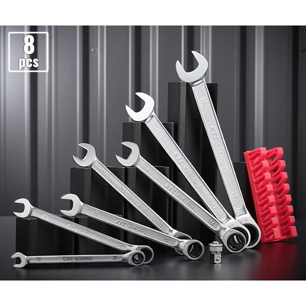 KTC ラチェットコンビネーションレンチセット [8点組] ホルダー付き MSR1A-8PHBKTCのこだわりが詰まった、高機能レンチセット!主要サイズ7本と、9.5sq.対応のドライブ角アダプターをセットにしたお得なオリジナルセットです。プロの整備士はもちろん、DIYユーザーにもおすすめです。工具箱内でレンチがバラバラにならない、便利なホルダー付き。ラチェット部は本締め対応!スパナ&ラチェット部ともに薄型ヘッドを採用し、狭い場所での作業を快適に!梨地メッキ+滑り止めドット加工で、オイルが付いた手でも滑りにくいグリップデザイン!14mmレンチにドライブ角アダプターをセットすれば、9.5sq.ラチェットハンドルとして使用可能!仕様型式:MSR1A-8PHBメーカー:KTC(京都機械工具株式会社 x エヒメマシンオリジナル)