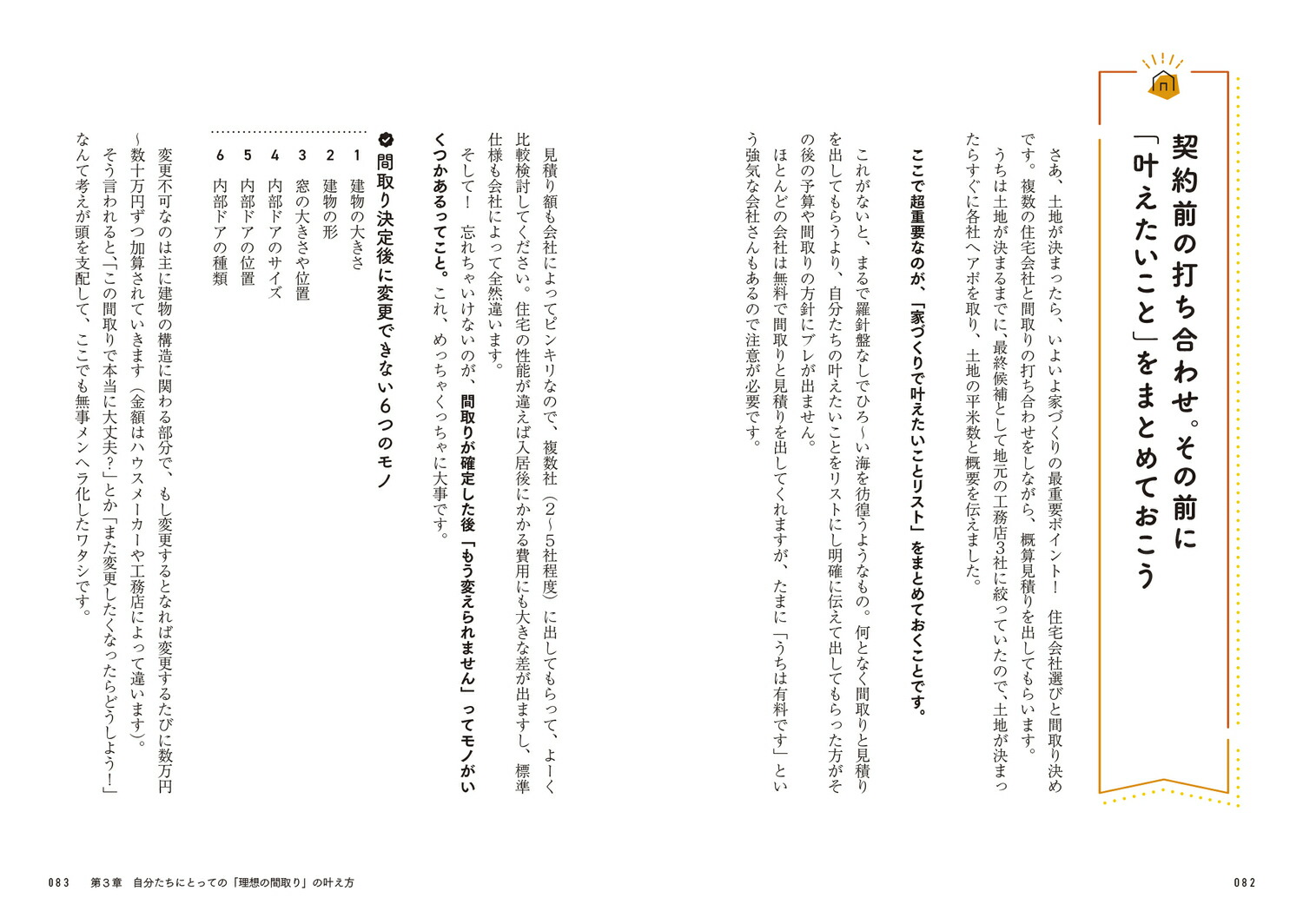 第1章 ハウスメーカー?工務店?違いって何なのよ/第2章 「子ども第一!」の土地探しで起きたこと/第3章 自分たちにとっての「理想の間取り」の叶え方/第4章 ついにその時が来た!初期見積りチェックとローン審査/第5章 みんな大好きメインイベント内装打ち合わせ/第6章 いよいよ着工、そして完成へ
