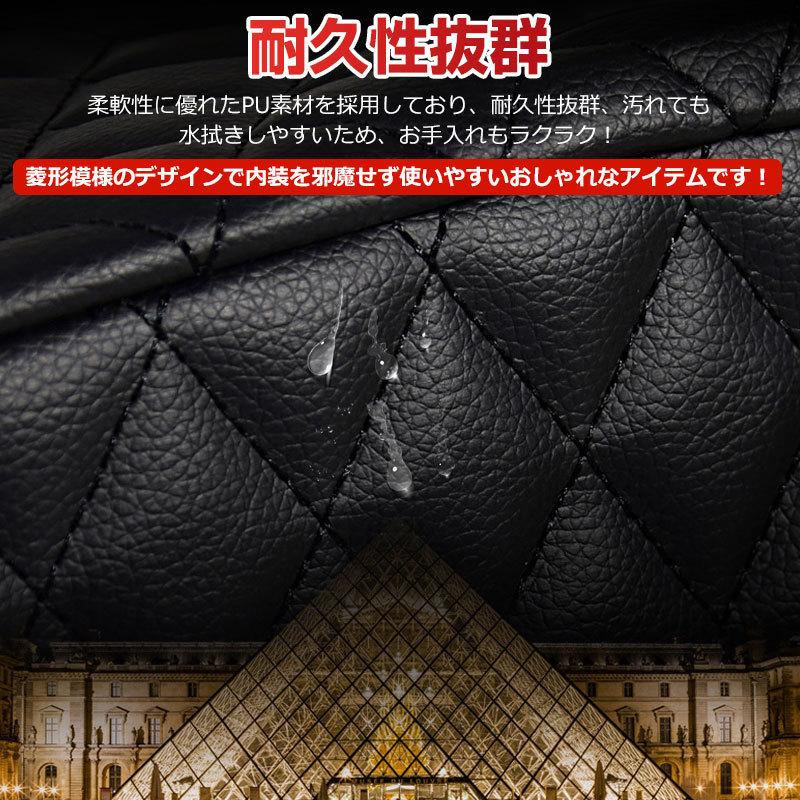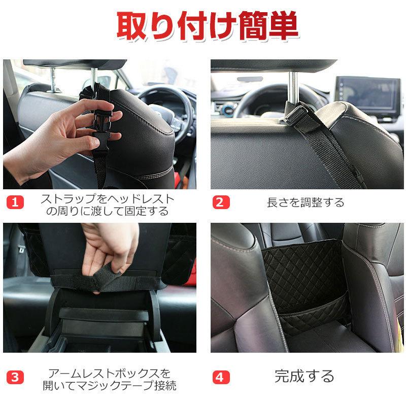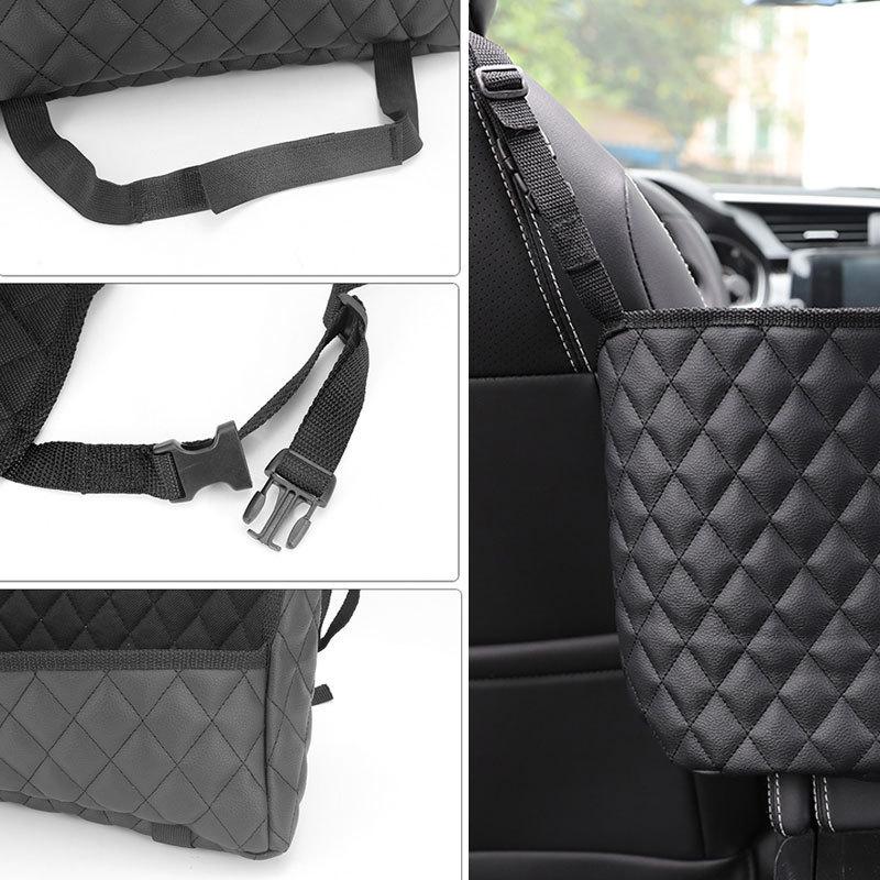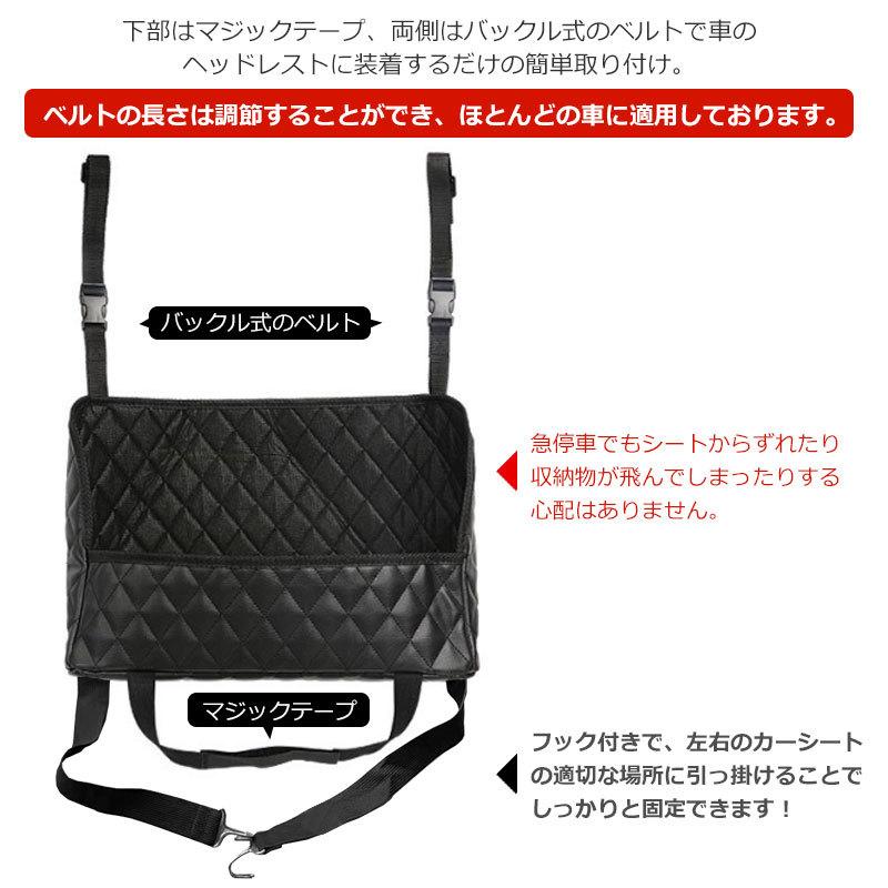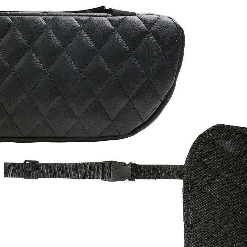 柔軟性に優れたPU素材を採用しており、耐久性抜群、汚れても水拭きしやすいため、お手入れもラクラク!菱形模様のデザインで内装を邪魔せず使いやすいおしゃれなアイテムです!下部はマジックテープ、両側はバックル式のベルトで車のヘッドレストに装着するだけの簡単取り付け。ベルトの長さは調節することができ、ほとんどの車に適用しております。