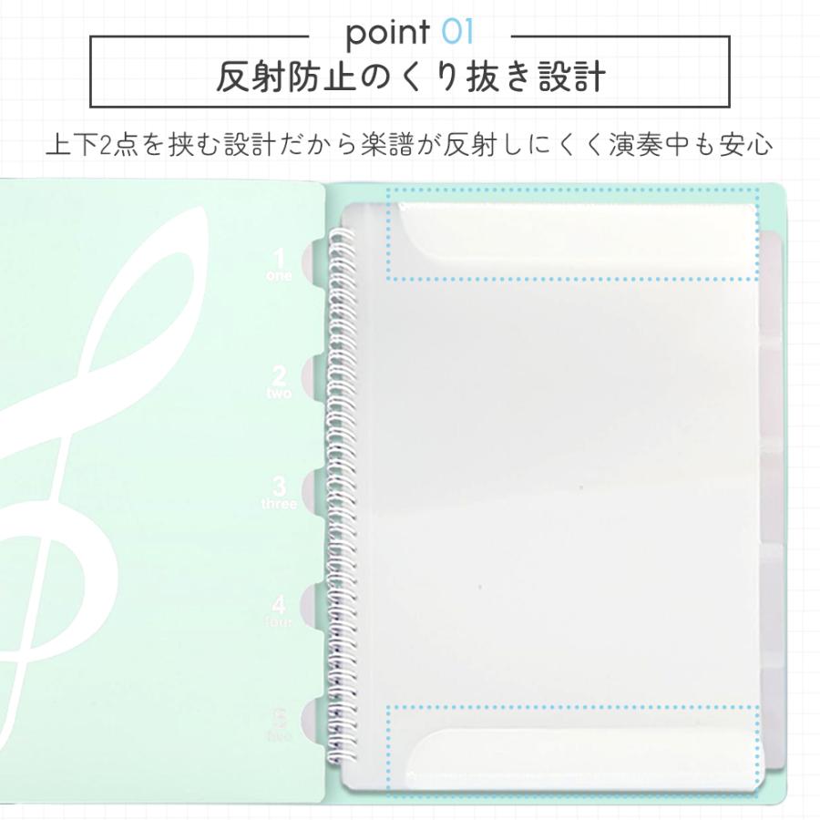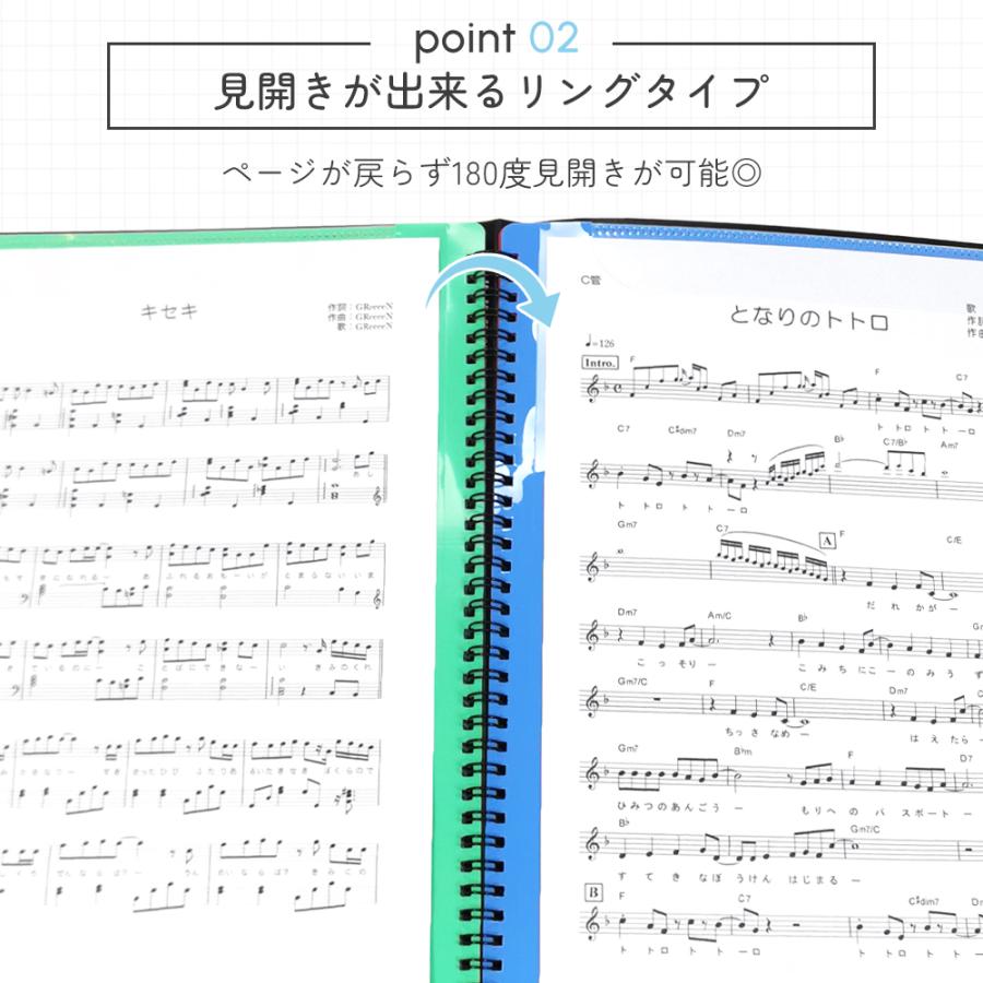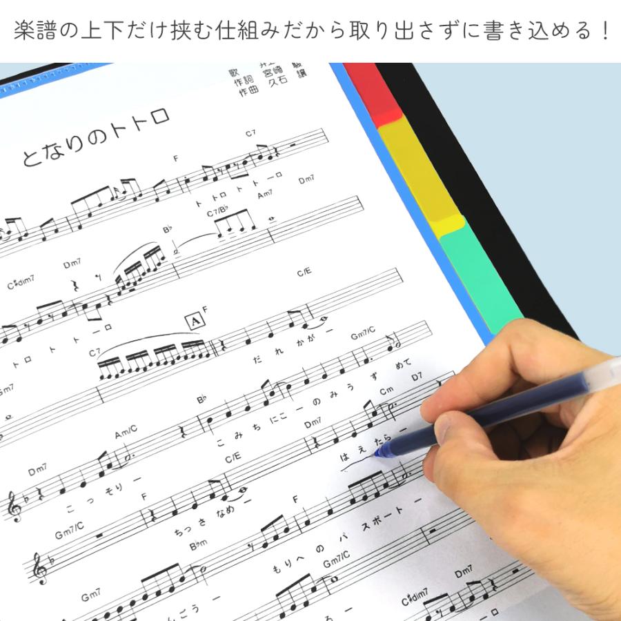 楽譜をポケットに入れるのではなく上下で挟むタイプのファイルなので、楽譜を取り出すことなく書き込むことが可能。