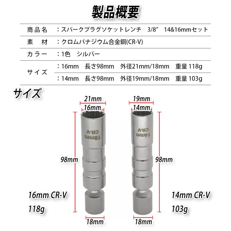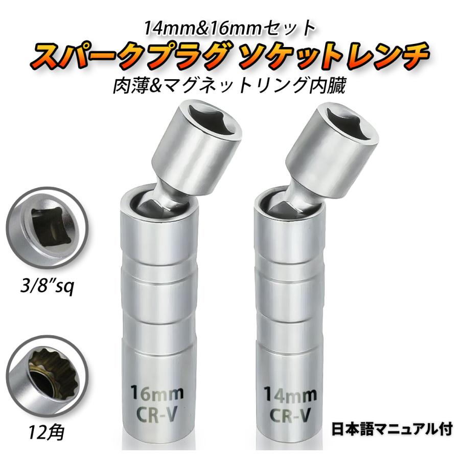 スパークプラグソケット レンチ プラグソケット 2本セット 14mm 16mm 3/8 マグネット 首振り ユニバーサルソケット