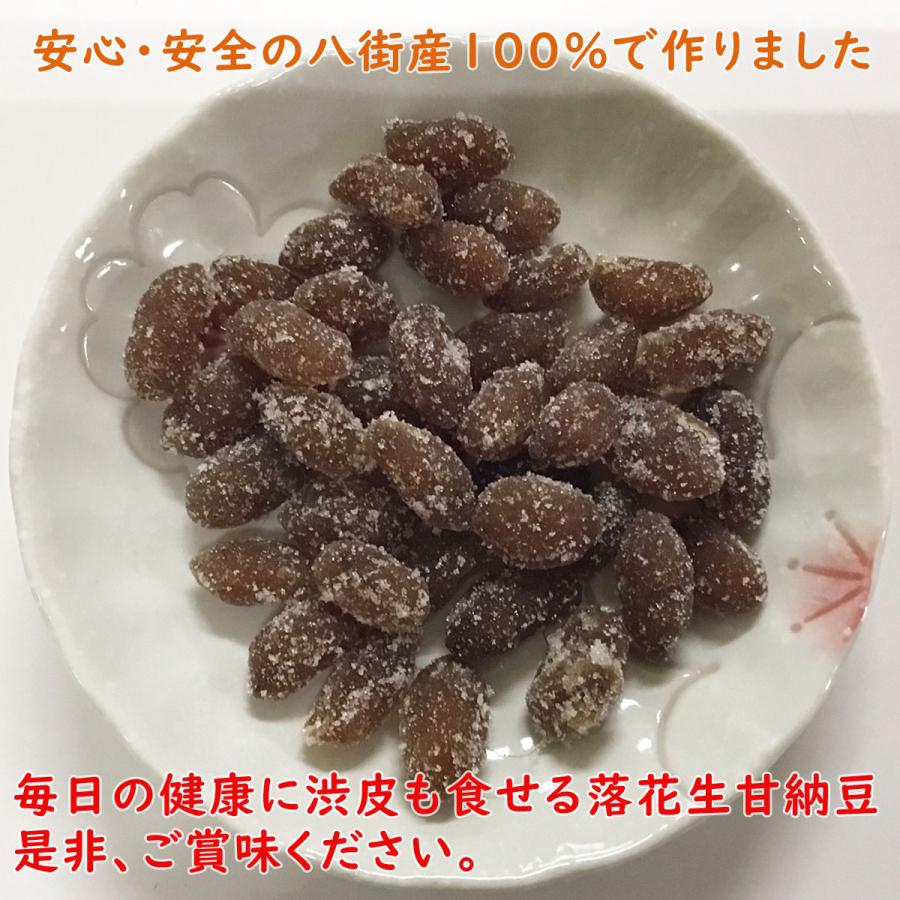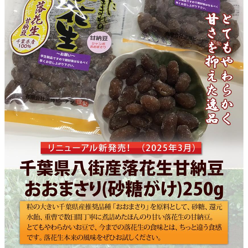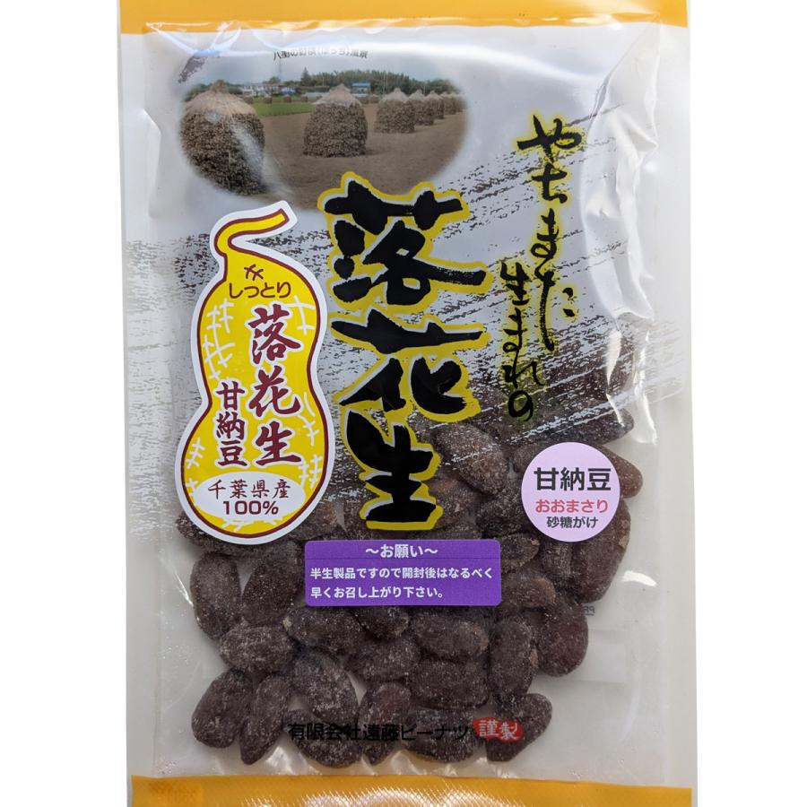 粒の大きい千葉県産推奨品種「おおまさり」を原料として、砂糖、還元水飴、重曹で数日間丁寧に煮詰めたほんのり甘い落花生の甘納豆。