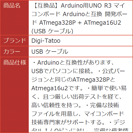 バリエーションコード : 2BJD0GHCCX・Arduinoと互換性があります、 USBでパソコンに接続。・公式バージョンと同じのATmega328PとAtmega16u2です。・簡単で使い易く、且つ厳しい出荷テストを経て、高い信頼性を持つ。・完備な技術ファイルを用意し、マイコンボード技術専門家がサポートする。・デジタル I / Oピンに対し、完備な備考情報をマークする。