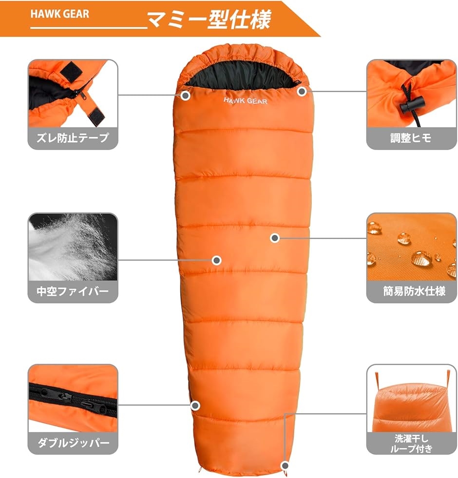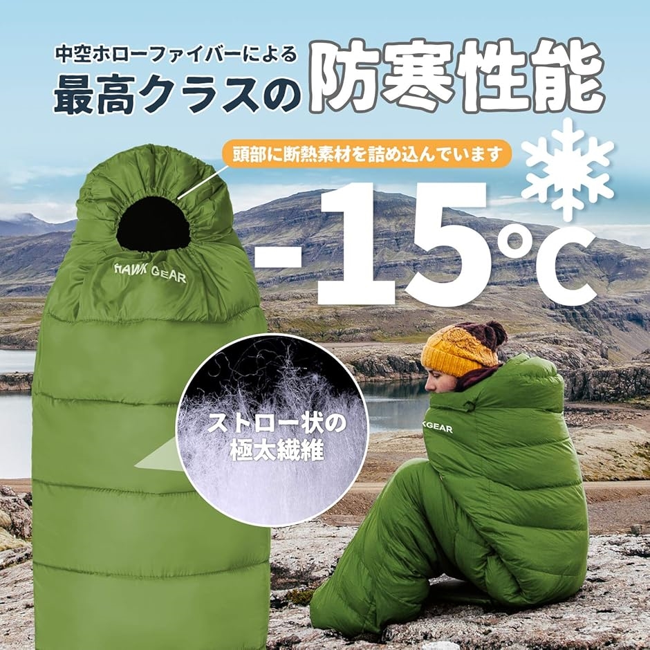 バリエーションコード : 2B4Q6LHYC2HAWK GEAR(ホークギア)のマミー型寝袋(シュラフ)です。-15度耐寒。丸洗い可能。水温30℃以下で洗い、乾燥機を使わず日干しくださいませ。素材 コットンファイバー ・仕様 簡易防水・防風仕様ホークギア(HAWKGEAR)はワールドスポーツオンラインブランドのアウトドアラインです。ワールドスポーツオンライン・HAWK GEAR(商標登録証番号:第5854776号・6125145号)
