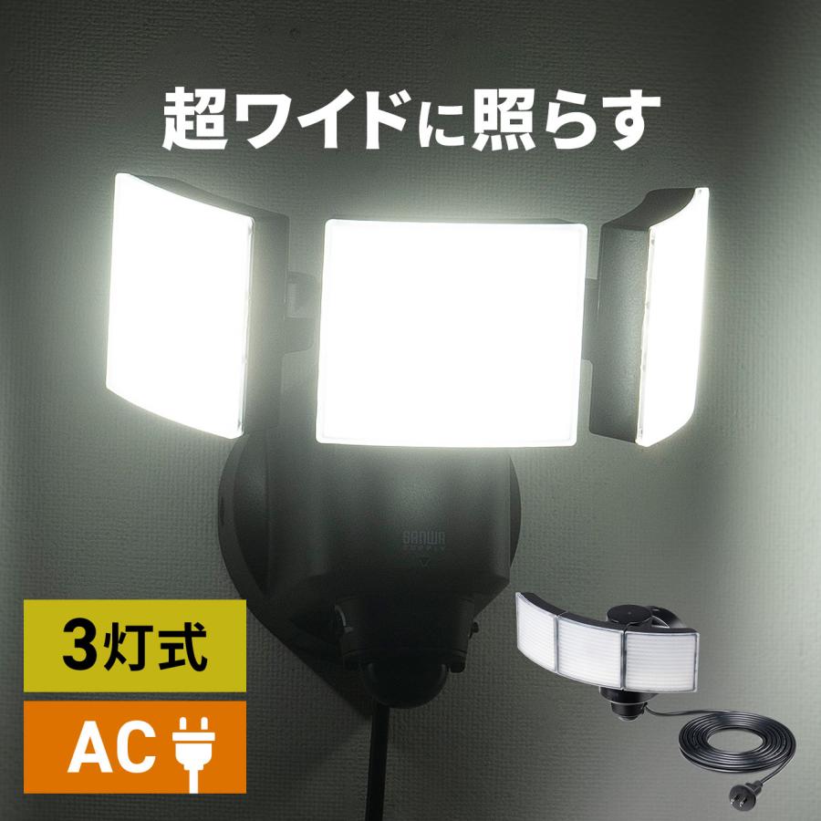 センサーライト 屋外 LED 玄関 防犯 駐車場 コンセント 防水 3灯 5m 人感センサー 100V 角度調整 明るい 3000ルーメン 800-LED087BK