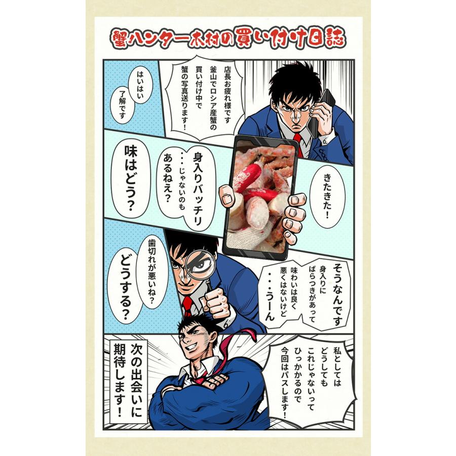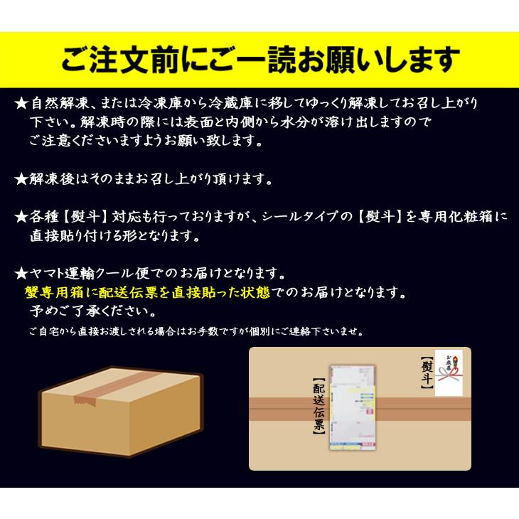 蟹はもともと水分が多い特性上、解凍後にNET重量から10%前後目減りすることがあります。予めご了承下さいますようお願い申し上げます。