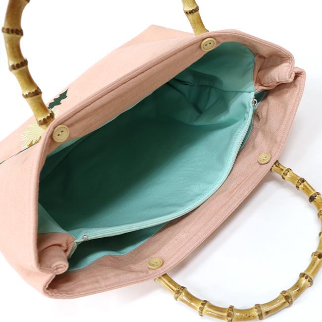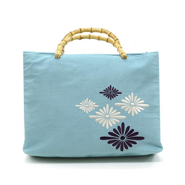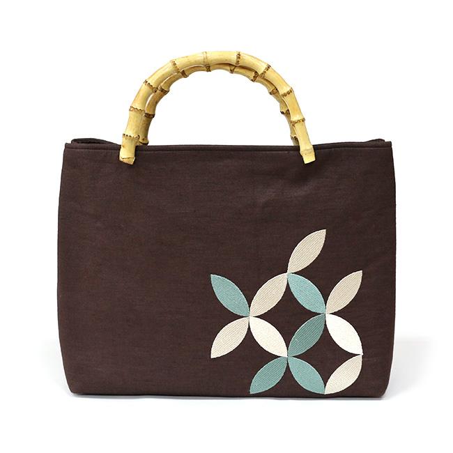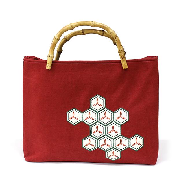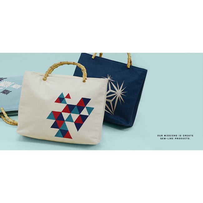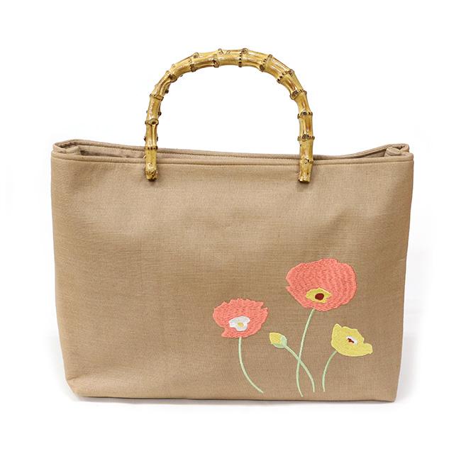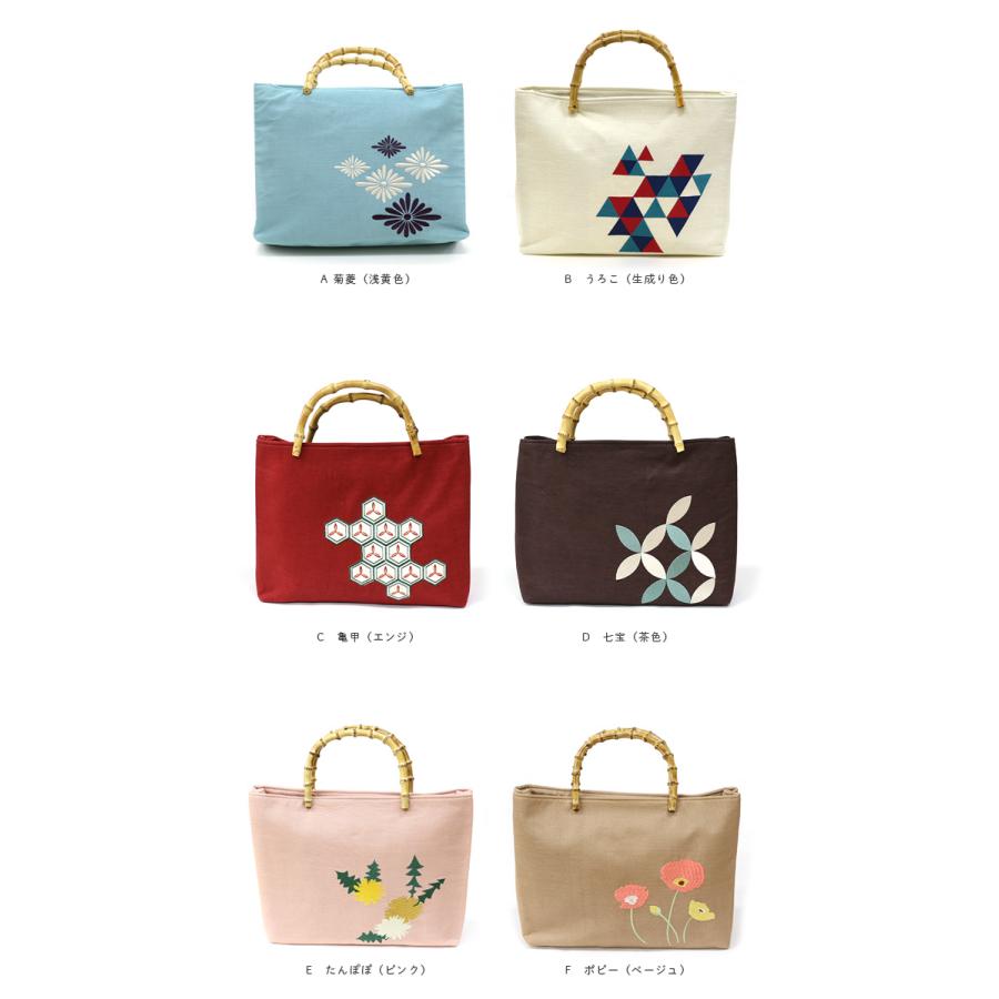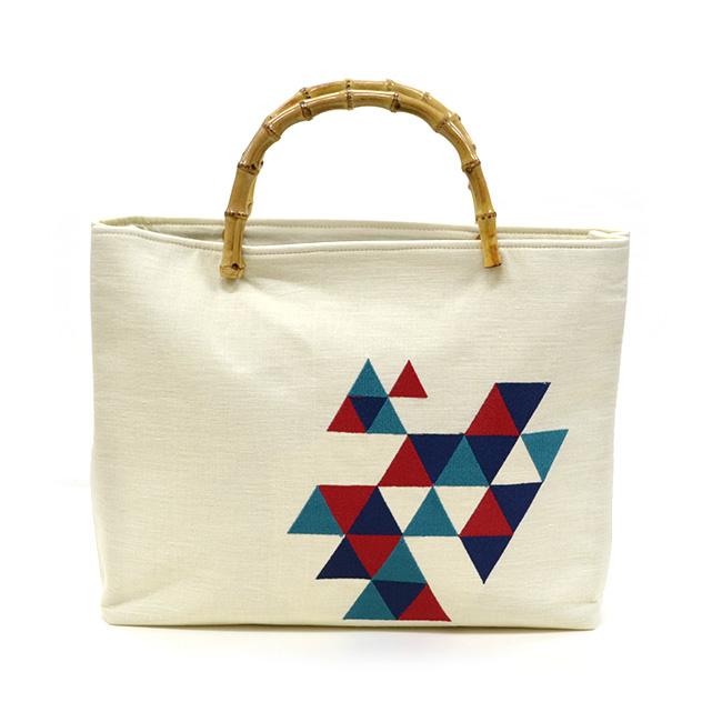 ※※麻生地刺繍入りバッグ 竹の持ち手 菱菊 うろこ 麻の葉品質表地:麻100%、刺繍糸:ポリエステル100%裏地:ポリエステル100%持ち手:竹製品本体サイズ(約)高さ(持ち手含まず):28cm×横:37cm×マチ:10cm※この製品は、中国における日本企業の工場で製造されたものです。※この製品は強い摩擦や水濡れにより色落ちが生じる場合があります。お取り扱いにご注意ください。※写真の光加減や、ご覧いただく環境によって色味が若干異なる場合がございます。※※