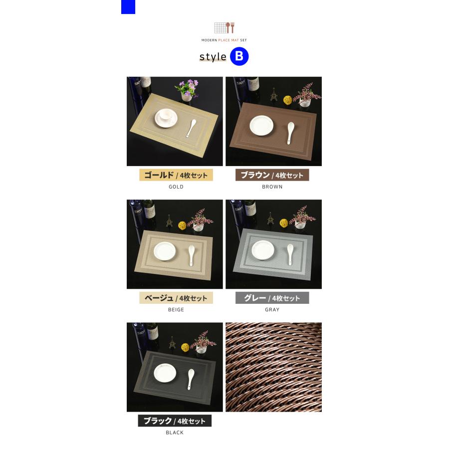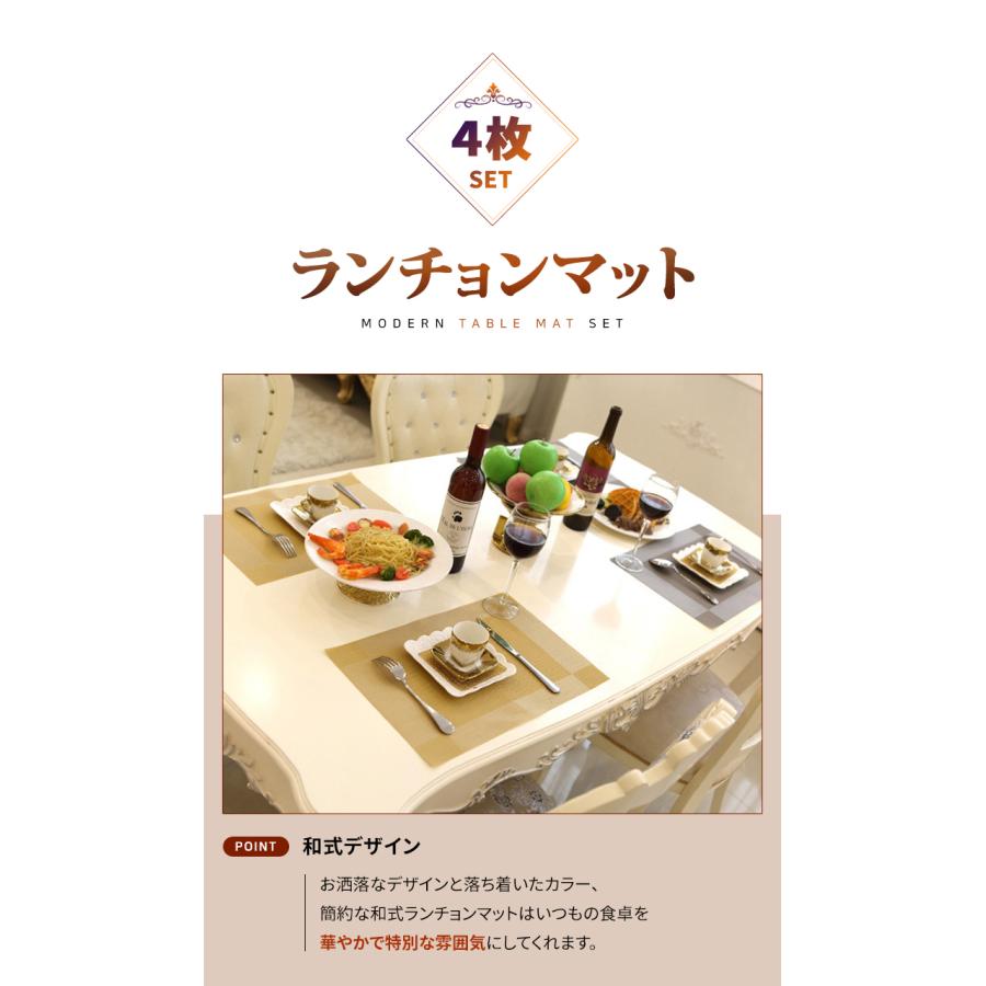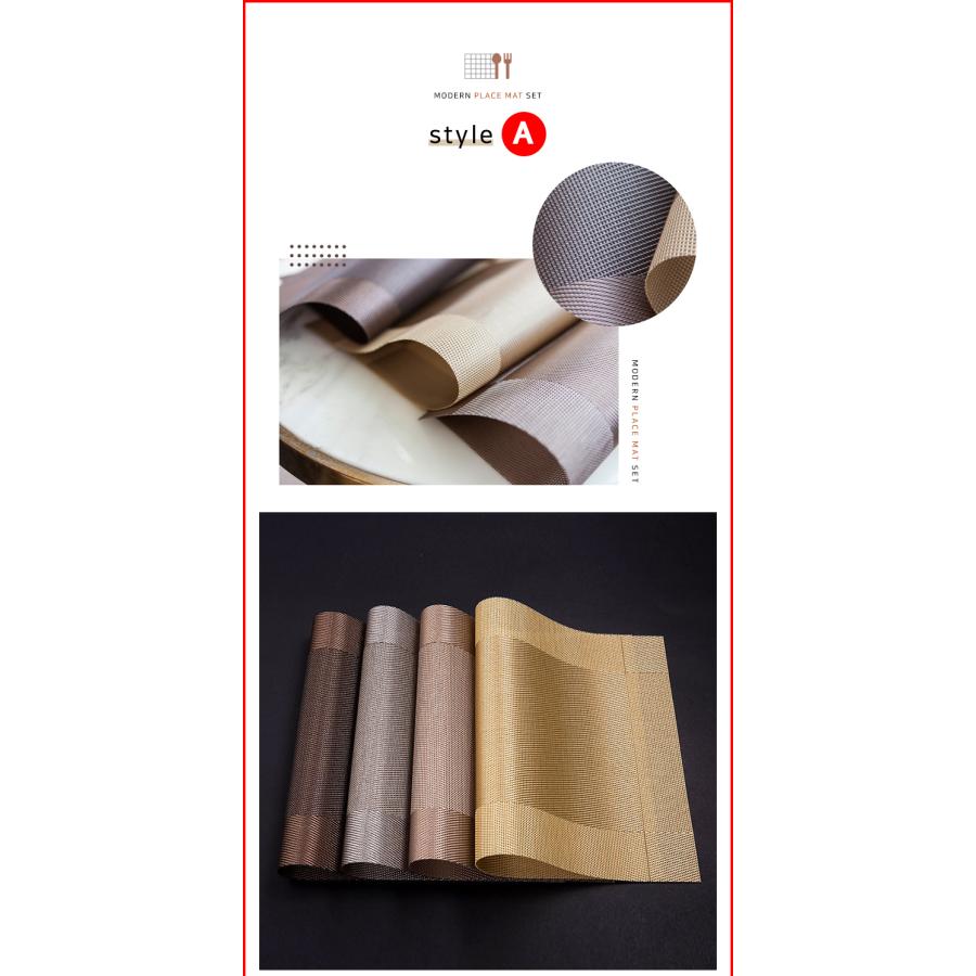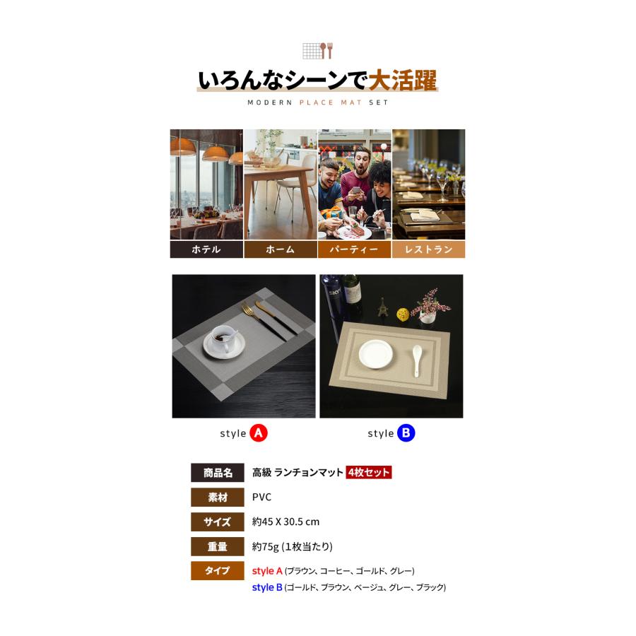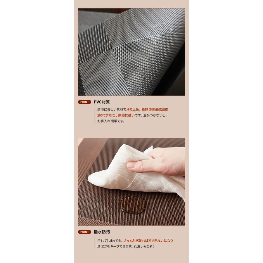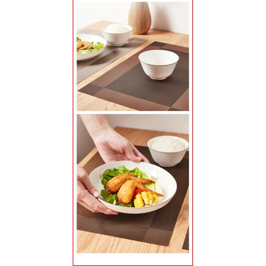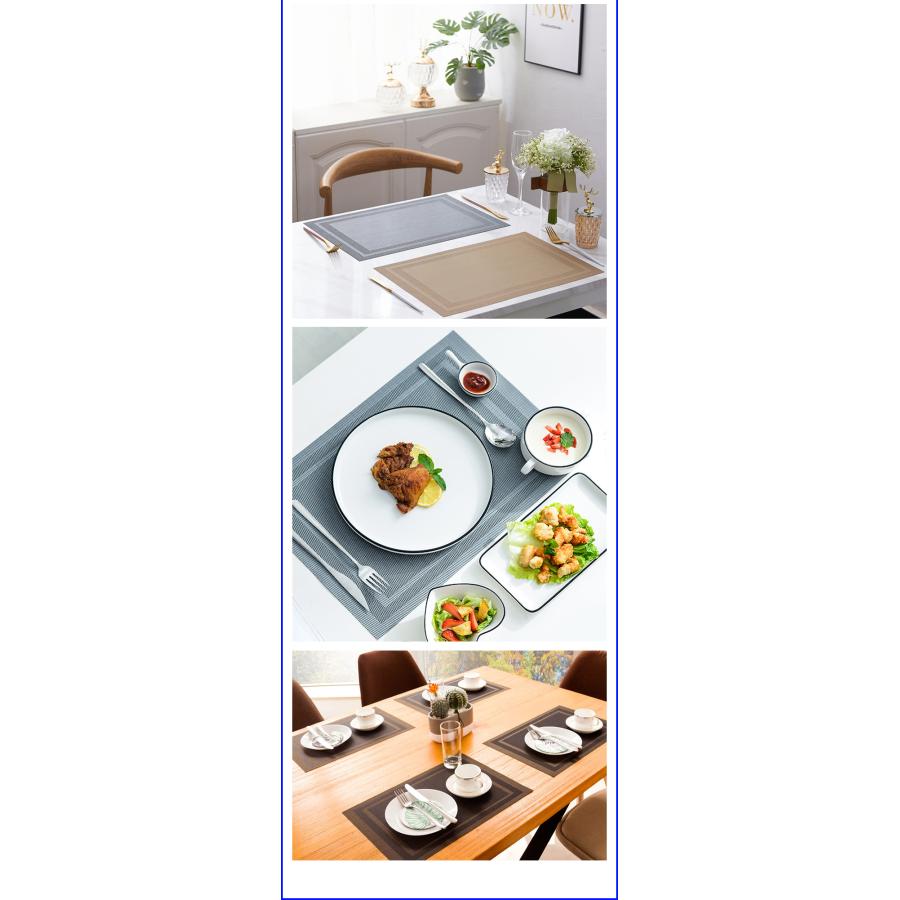商品名 : ランチョンマット 4枚セット素材 : PVCサイズ : 約45 X 30.5 cm重量 : 約75g (1枚当たり)飽きのこないシンプルなデザインでいつもの食卓を華やかで特別な雰囲気にしてくれます。 丸洗い可能!汚れてしまっても、さっとふき取ればすぐきれいになり清潔さをキープできます。シワがつきにくい素材なのでお手入れ簡単!環境に優しい素材で滑り止め、 断熱(耐熱最高温度200℃までに)、摩擦に強いです。 爆買