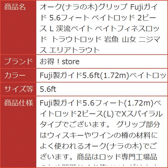 Fuji製ガイド5.6フィート(1.72m)ベイトロッド2ピース(L)でXスパイラルタイプでございます。