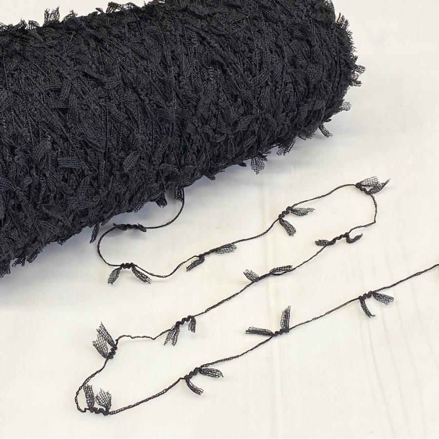 ブラックチュールを使用したラッセルモール。お手持ちの糸に加えて引き揃えたりすれば、様々な表情を引き出してくれること間違いない糸です♪例えば、画像3枚目のように商品コード:M2700ブラックスラリットフリンジ、M5203ラメループなどで引き揃えても素敵ですよ。【素材】カチオンエステル64%(チュール) ナイロン 36%(芯)【番手】1/4.5【長さ】10gで約45m※紙管はおよそ30gとなります。※2個以上お買い上げの場合は、1本巻でのお届けになる場合がございます。