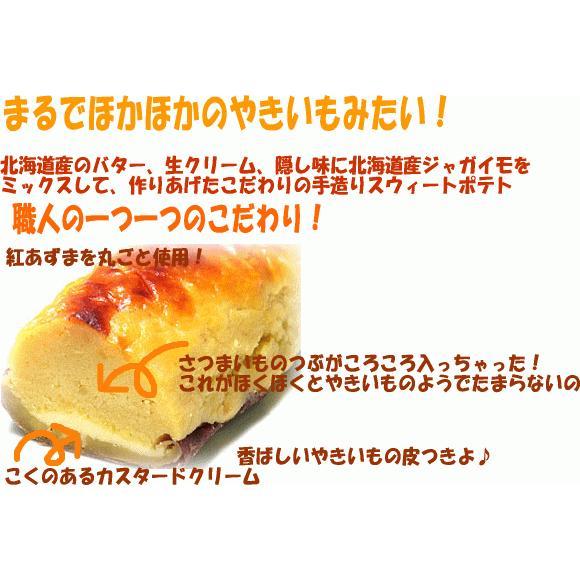 原材料:さつまいも、フラワーペースト(小麦粉を含む)、小豆餡(砂糖、小豆、寒天、食塩)、砂糖、バター、白餡(砂糖、白いんげん豆、じゃがいも、水飴、食塩)、卵、生クリーム、蜂蜜、じゃがいも、食塩、トレハロース、調味料(アミノ酸)、香料、増粘多糖類、乳化剤(大豆由来)、リン酸塩(Na)、酸味料、着色料(クチナシ、カロテン)