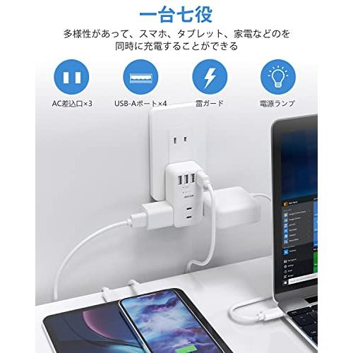 ・「1台7役・コンセントタップ」4つのUSB-Aポートと3つのAC差込口を搭載したマルチタップです。また、ACコンセントを3方向に分配して、小型ACアダプタを同時に挿入しても干渉せず、配線がすっきりしています。