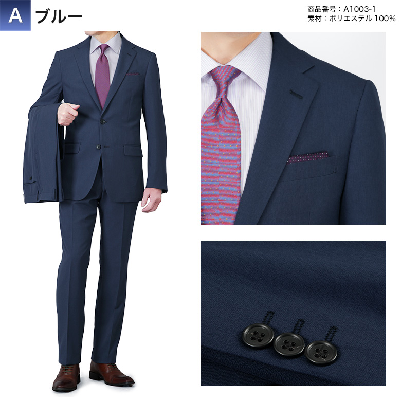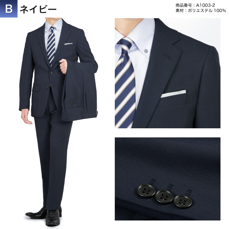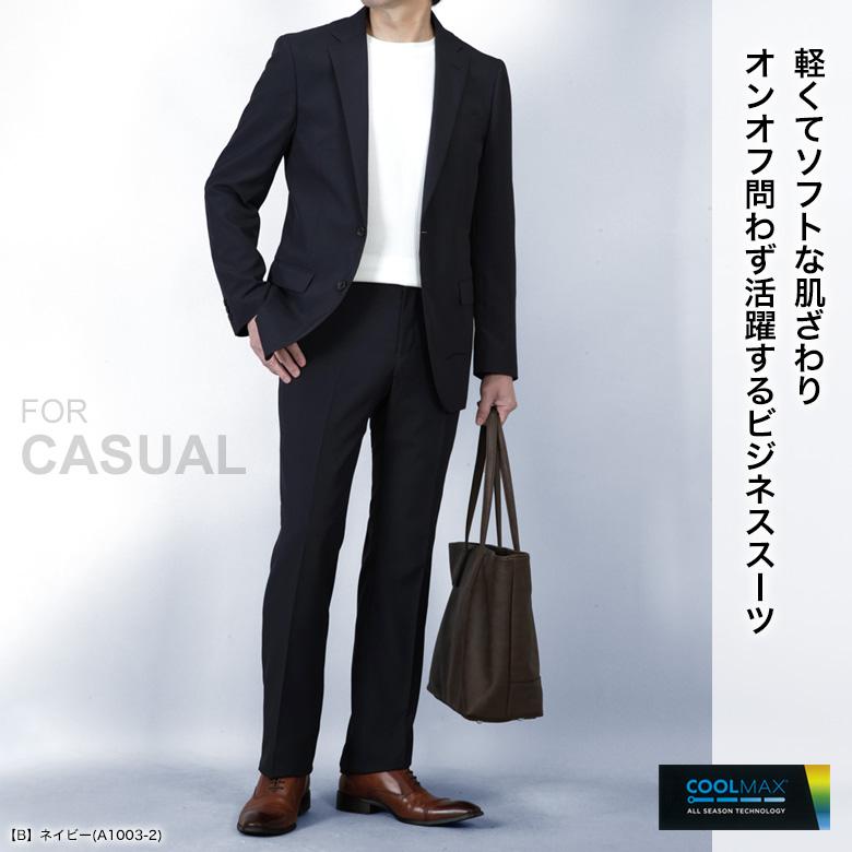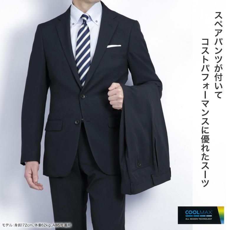 吸水速乾性を備えた高機能素材、クールマックスを使用したツーパンツスーツ。スリムなシルエットとノータックデザインが洗練された印象を与えます。クールマックス素材を使用しているため、吸水速乾性に優れ、一日中涼しくドライな着心地を実現。春夏秋の3シーズンで快適に着用できます。上下洗えるウォッシャブル仕様で、お手入れも簡単です。スペアパンツが付属しており、洗い替えにも便利。スペアパンツの裾をそれぞれシングルとダブルで仕立てると、1着のスーツで2種類の印象を得られ、コストパフォーマンスの高い商品です。防シワ性に優れたストレッチ素材を使用しているため、動きやすく、長時間の着用でも快適です。ビジネスはもちろん、カジュアルなどさまざまなシーンで活躍する一着です。
