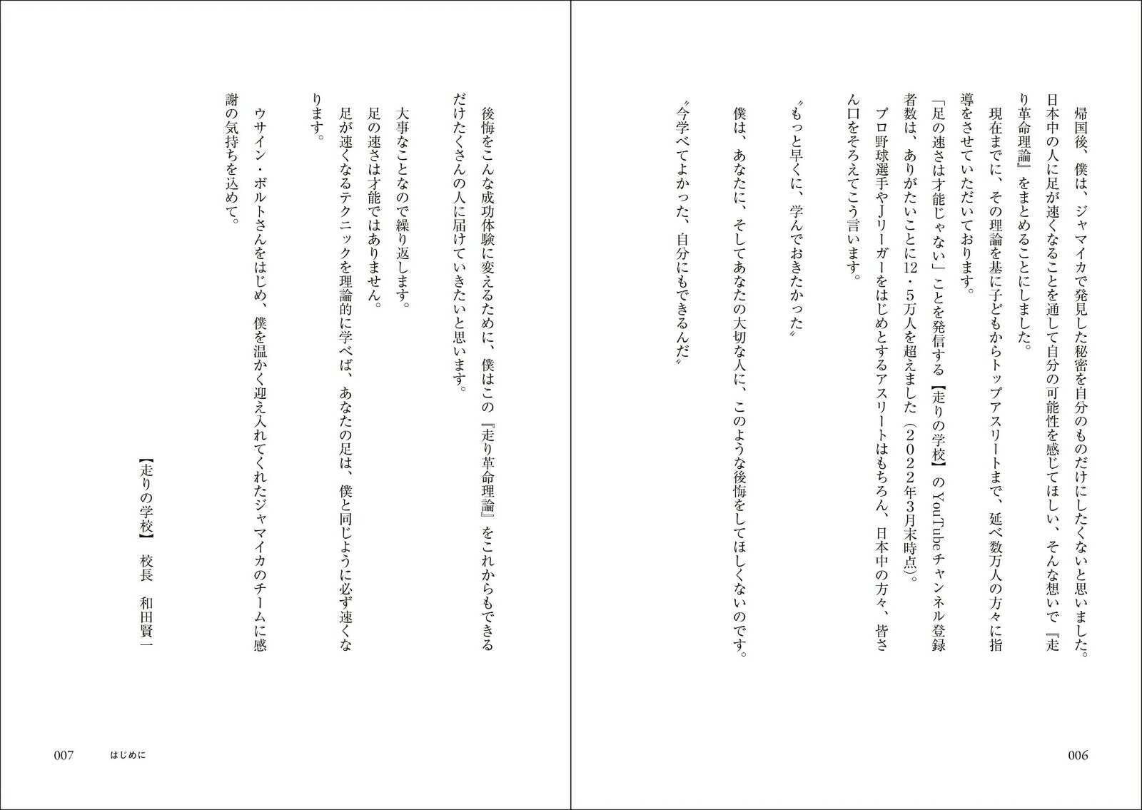 和田賢一(ワダケンイチ)“走りの学校”校長。1987年、東京都江戸川区出身。子どもの頃の夢はプロ野球選手になることだったが、周囲の人に「才能がない」と言われ挫折。スポーツトレーナーを目指す過程で、ライフセービング競技であるビーチフラッグスに出合う(世界選手権2位、全日本選手権3連覇達成)。世界記録保持者でオリンピック金メダリストのウサイン・ボルト氏と3カ月間練習を共にし、100mのタイムを1秒縮める。その経験を基に誰でも足が速くなるための『走り革命理論』を構築。その後“走りの学校を創設。校長として全国に教室やオンライン教室を展開し、子どもたちの足を速くする活動を行っている。プロ野球選手やJリーガーなどプロ選手へのスプリント指導、走り革命理論講座を開催するなど、多方面で活躍(本データはこの書籍が刊行された当時に掲載されていたものです)